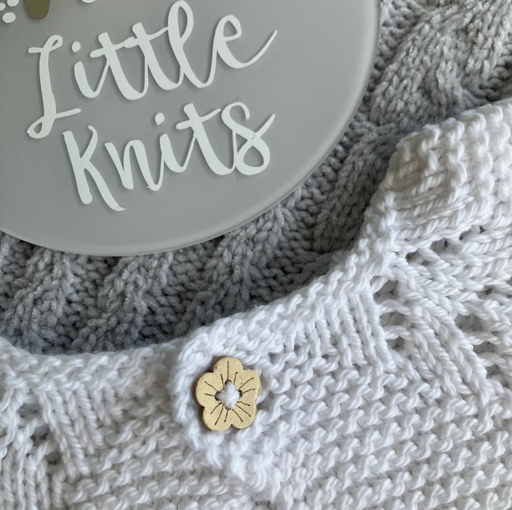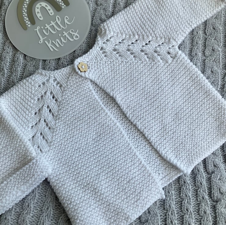 Hand-knitted baby girl’s cardigan to fit from 3-6 months. I have knitted this pretty little cardigan in a super soft pure white cotton yarn and finished it off with a flower shaped carved coconut shell button on the front fastening. The fir tree pattern on the sleeves gives added detail - a great addition to any girl’s wardrobe. Perfect for keeping your little one snuggly and warm on cooler days.
