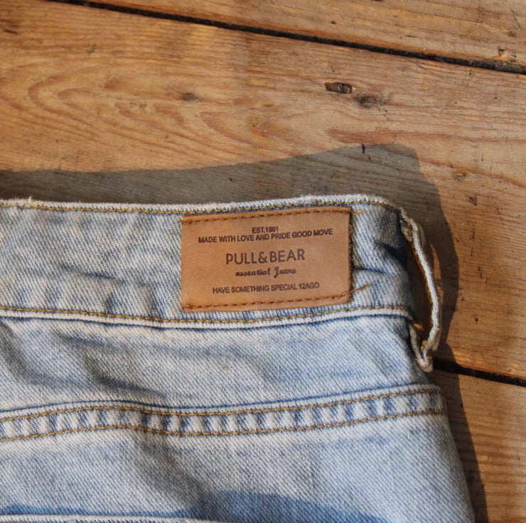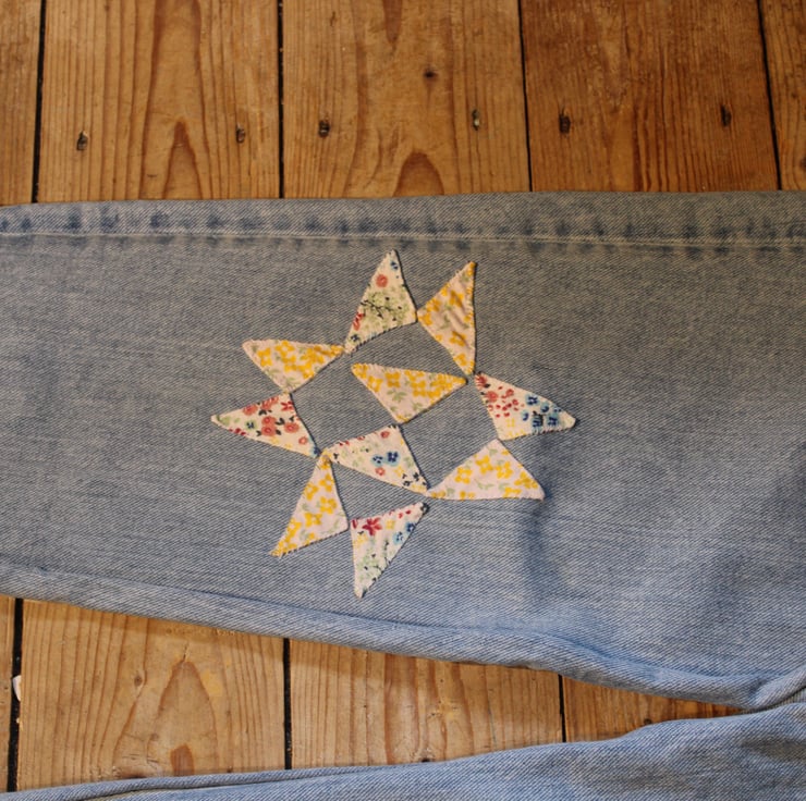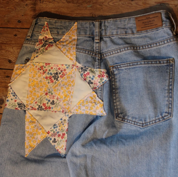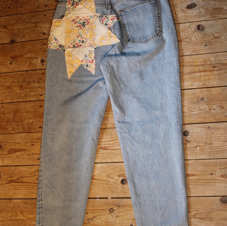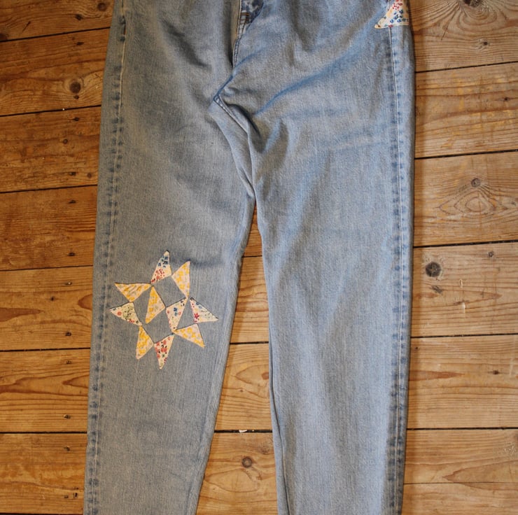 These are upcycled Pull & Bear straight leg light wash jeans. This piece has a custom quilt sun pattern on the back of the jeans and a matching mini design on the right knee. The sun is made with beautiful flower patterned fabric.