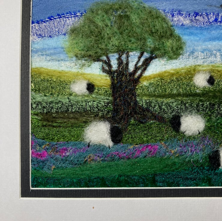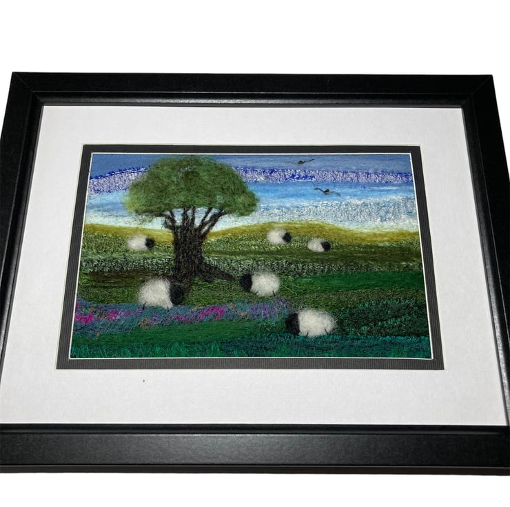 A lovely country scene of sheep grazing beneath a tree. This needle felt picture is made using strips of silk fabric and woollen fibres needle felted onto a felt base. No stitching is required as the silk and wool is bound together by the needle felting. After creating the background, a tree and the sheep have been added. The birds in the sky have been stitched on using black thread.