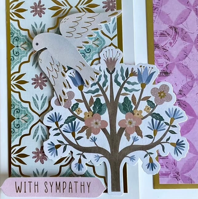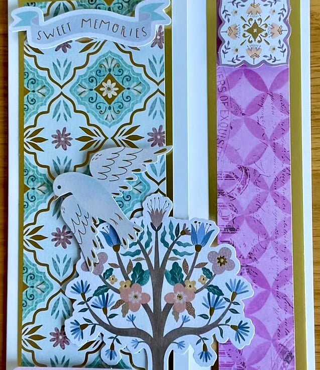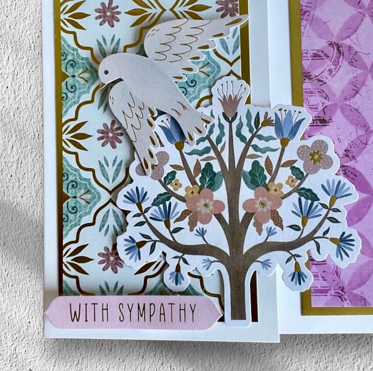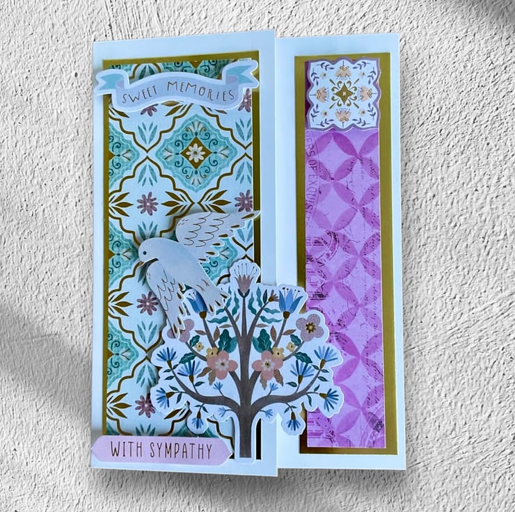The front of the card has been shaped to reveal the inside pattern which has been layered with gold card and a soft purple paper. The words ‘Sweet memories’ and ‘With sympathy’ have been added.
