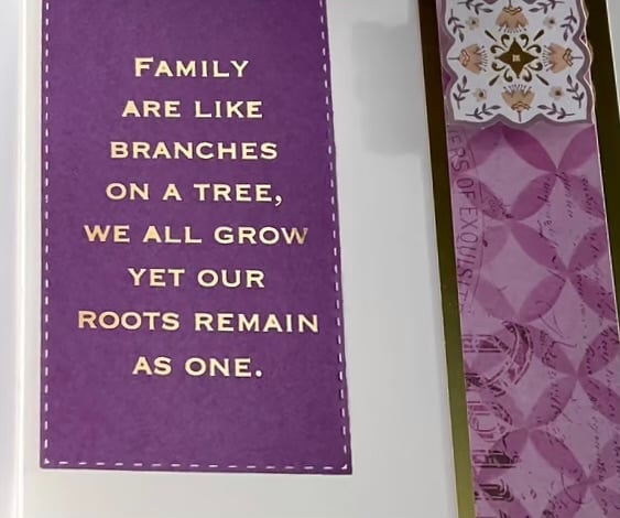 The wording ‘Family are like branches on a tree, we all grow but our roots remain as one’ in gold on a purple background have been added on the inside.