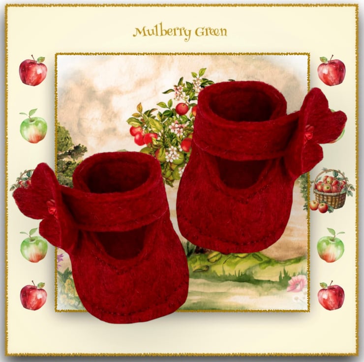 A lovely little pair of crimson shoes, decorated with felt flowers fastenings with little cupped flower sequins in the middle, to fit the Mulberry Green characters. The shoes look lovely with the little dresses.