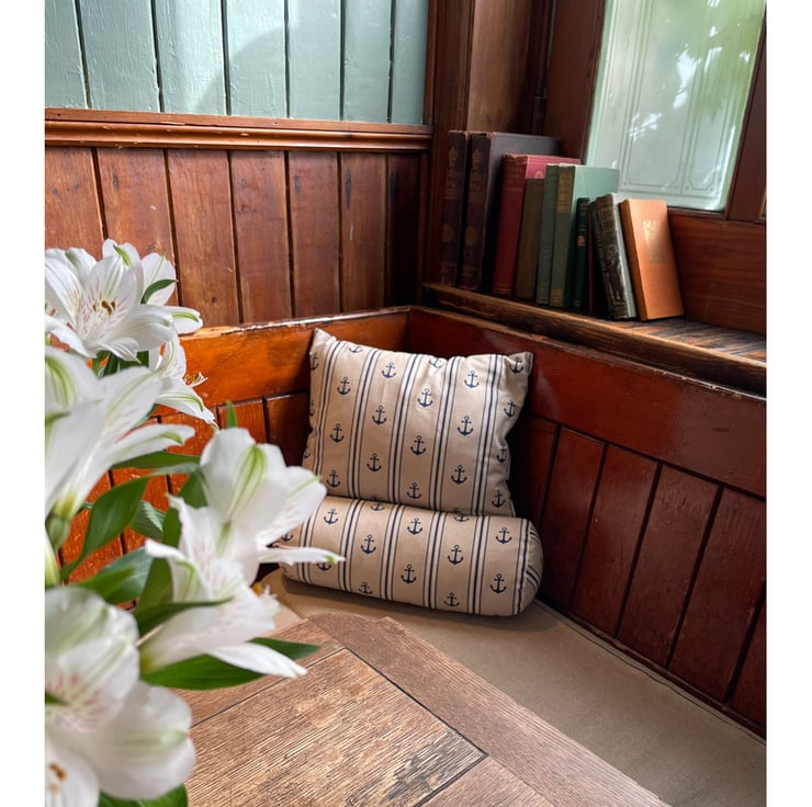 A nautical / maritime themed cushion cover - anchors and stripes in navy blue and white on a linen beige background.
