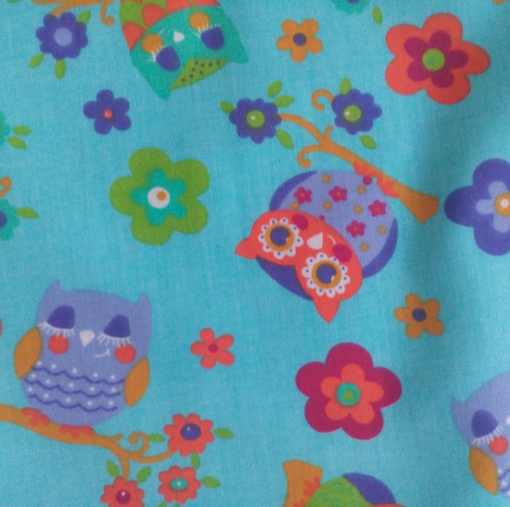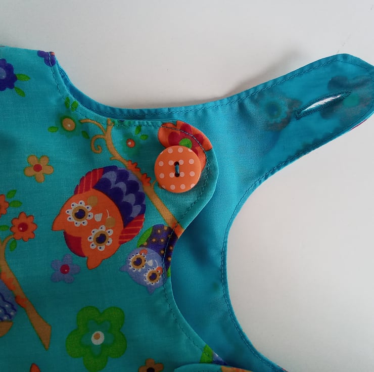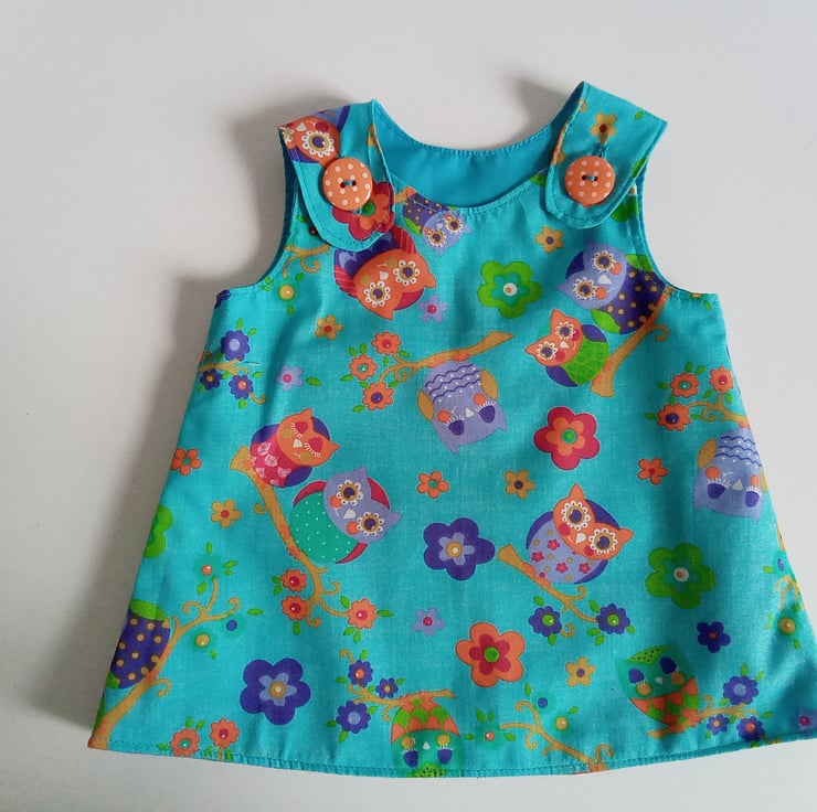 A line style dress/pinafore in pale blue with Owl and flowers design.