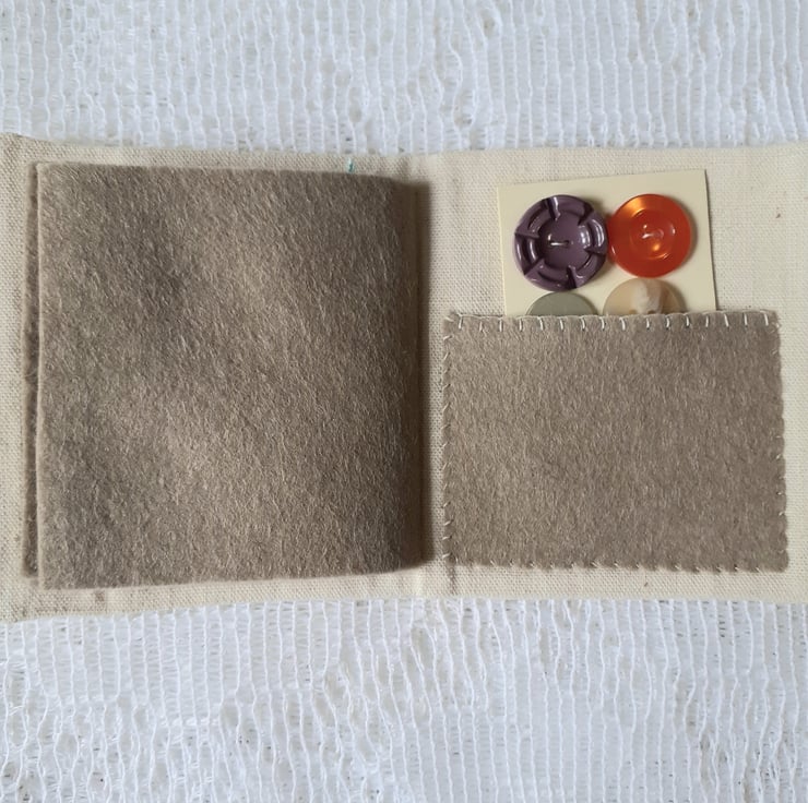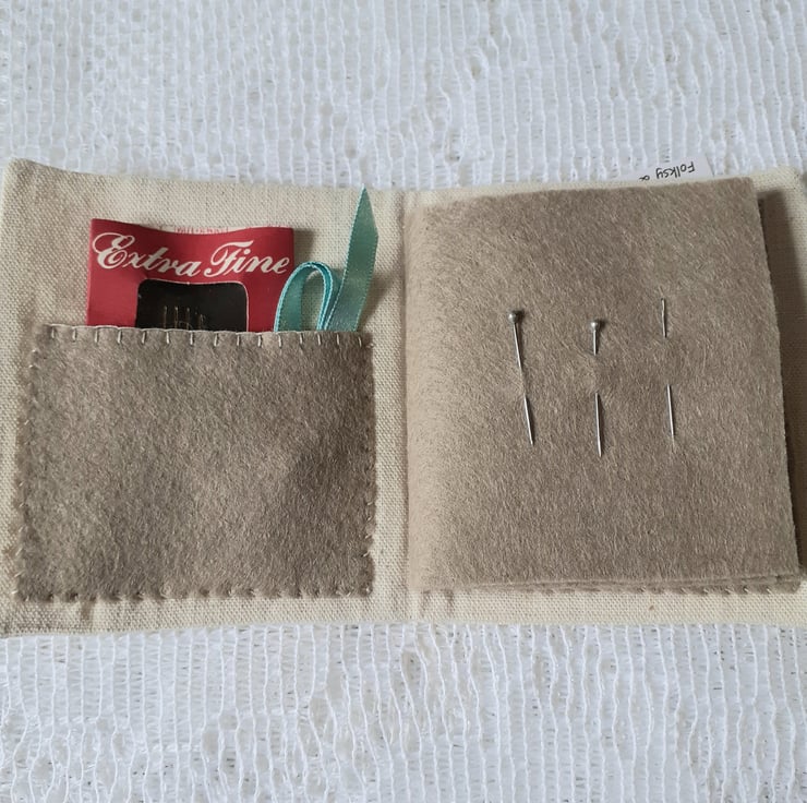 Has 4 felt pages and pocket to front and back. Measures 3.5x3" closed.