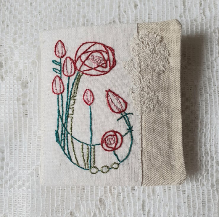 Made with vintage linen. The embroidery to front is done by hand and I've added a little piece of lace.