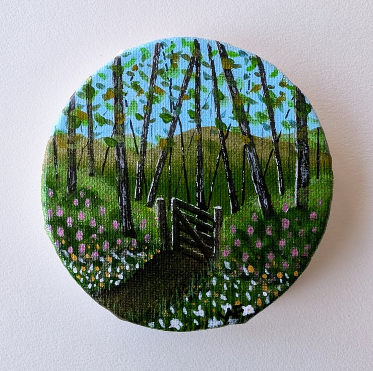 This is an original painting that depicts an entrance of a woodland via a wooden gate that is ajar, inviting the viewer to take a journey down into the woods. This painting captures the optimism of spring with flowers bursting into bloom along the path-side and the in the bushes, as well as the leaves starting to form within the treetops.