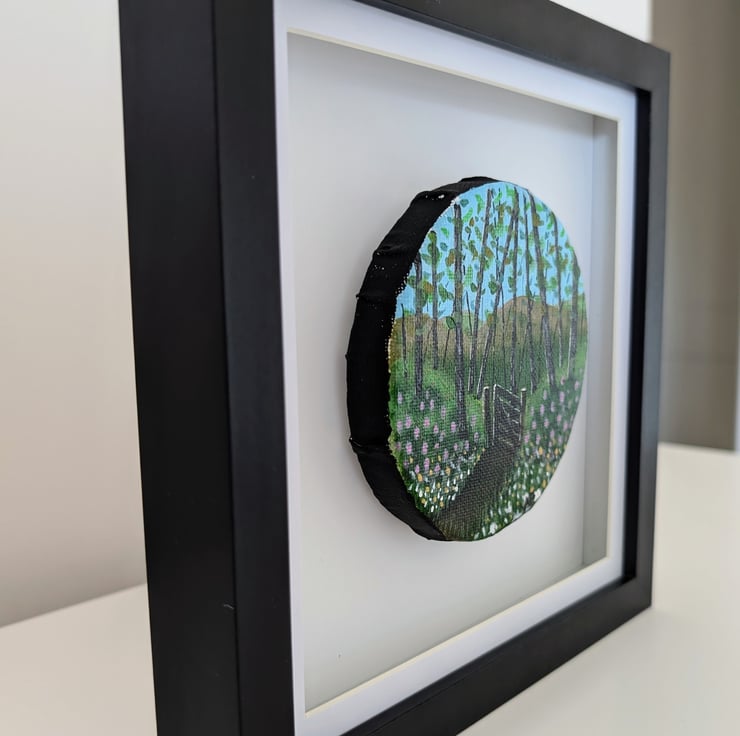 The painting itself is 10cm diameter, created on a circular stretched canvas, using acrylic paints and inks, before being varnished with gloss and framed in an 18 x 18 cm wooden box frame.