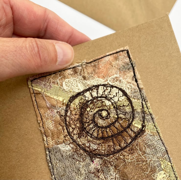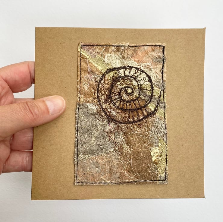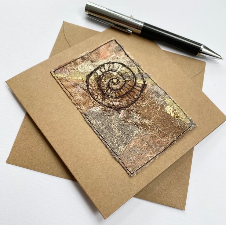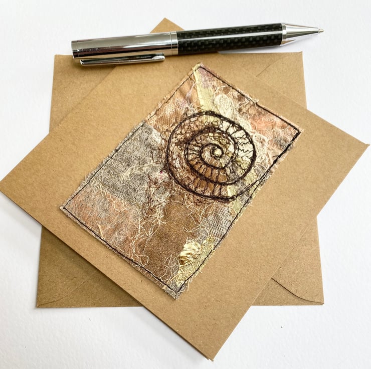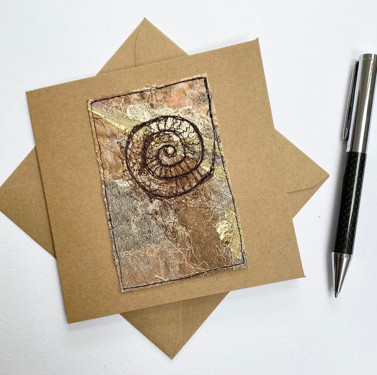 This stunning embroidered fossil ammonite card has been made with up-cycled fabrics and enhanced with free motion embroidery. It’s perfect for special people and occasions. It is blank inside. This brown card measures 13.5 x 13.5cm, comes with an envelop and in a plastic cover for protection.