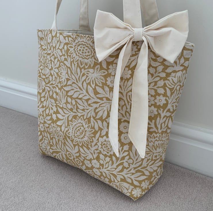 Beautiful handmade fabric tote bag decorated with a detachable bow. A medium sized bag, perfect for day to day use. Made from a John Lewis linen type fabric and interlined which gives it a soft feel and a little structure. Internally, it has a large slip pocket divided into two sections. It is decorated with a large fabric bow which compliments the internal fabric. This bow is attached to a crocodile clip so can be removed or reattached elsewhere on the bag if necessary. The square bottom gives the bag extra depth.