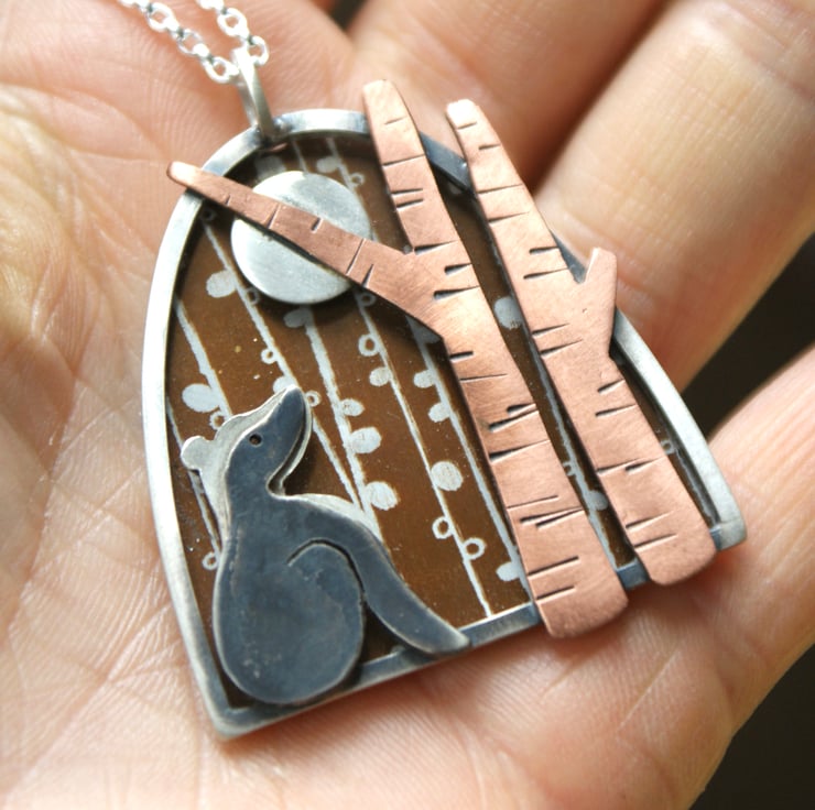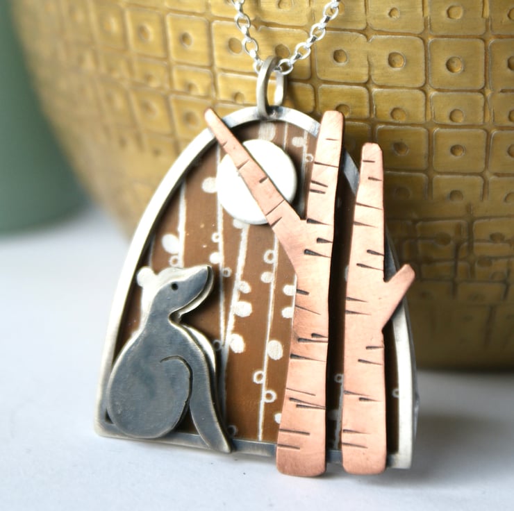 Perfect for any badger lover, this necklace is a little celebration of our woodlands. It features a hand cut sterling silver (part oxidised) badger looking up at a silver moon within some stylised trees. These have been textured, oxidised and polished back to give a satin finish.`This scene is framed by a sterling silver arch and has a bronze background which has been hand crafted from anodised aluminium. Hung from an 18 inch sterling silver chain (please ask if you'd like a different length).