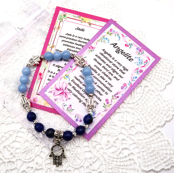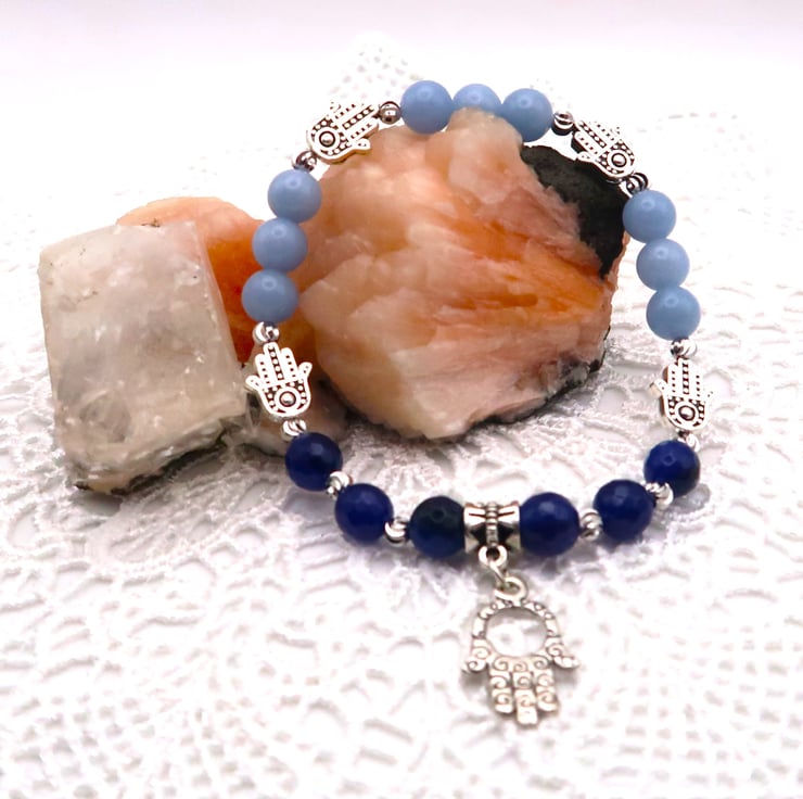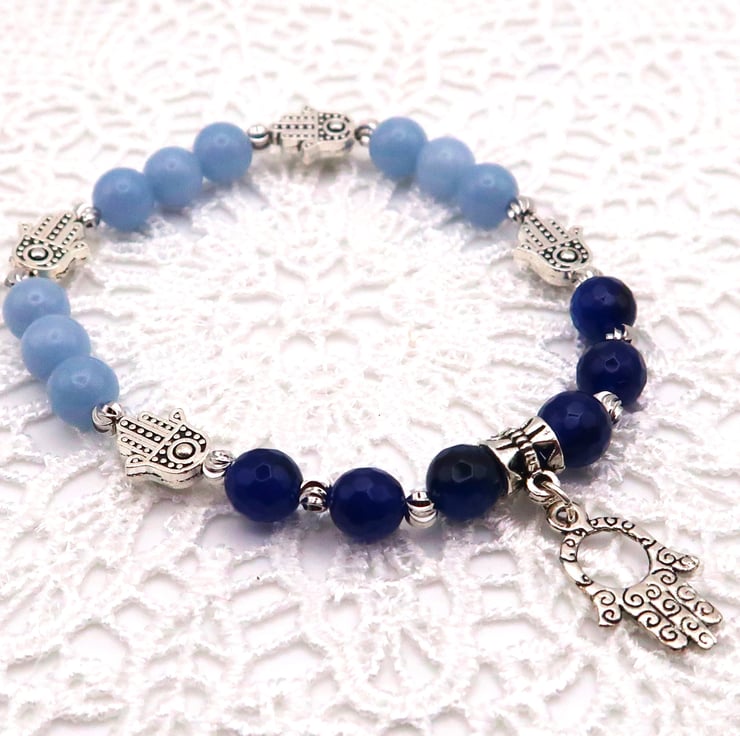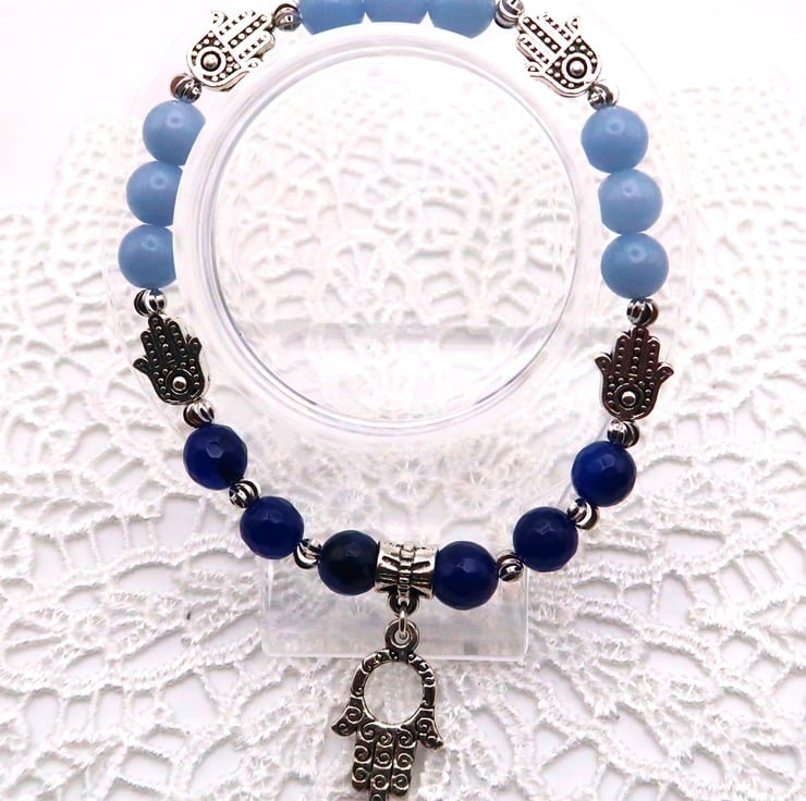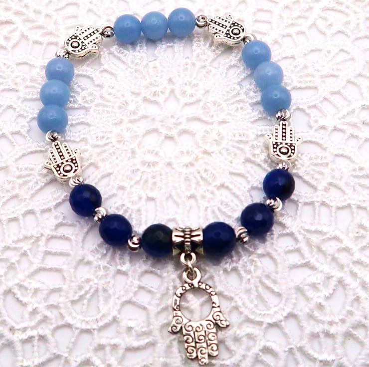 For this Bracelet I have used 8mm Dark Blue Facetted Jade Beads and 8mm Angelite Beads. The 4mm Spacer Beads are Platinum Coated and the Hamsa Hand Beads and Charm are Silver Plated.