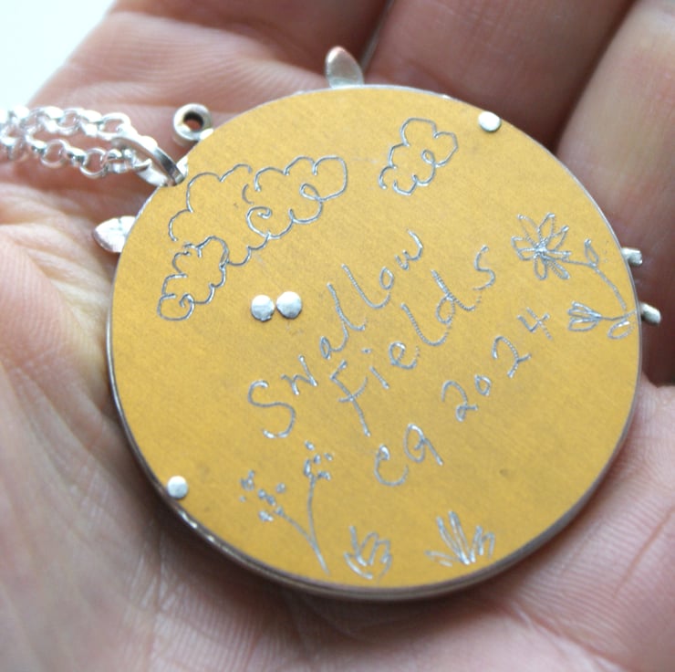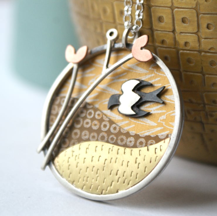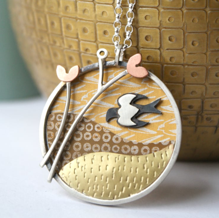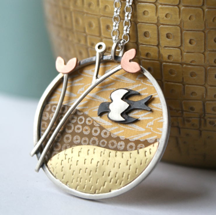 A reminder of summer days, this lovely necklace features a swallow flying across fields with some leafy stems in the foreground. The necklace is made from anodised aluminium, sterling silver, and copper and each piece has been carefully cut with a piercing saw and constructed in layers. The coloured aluminium pieces are patterned with a resist and immersion dyed. Hung from an 18 inch sterling silver chain. (Other lengths available).