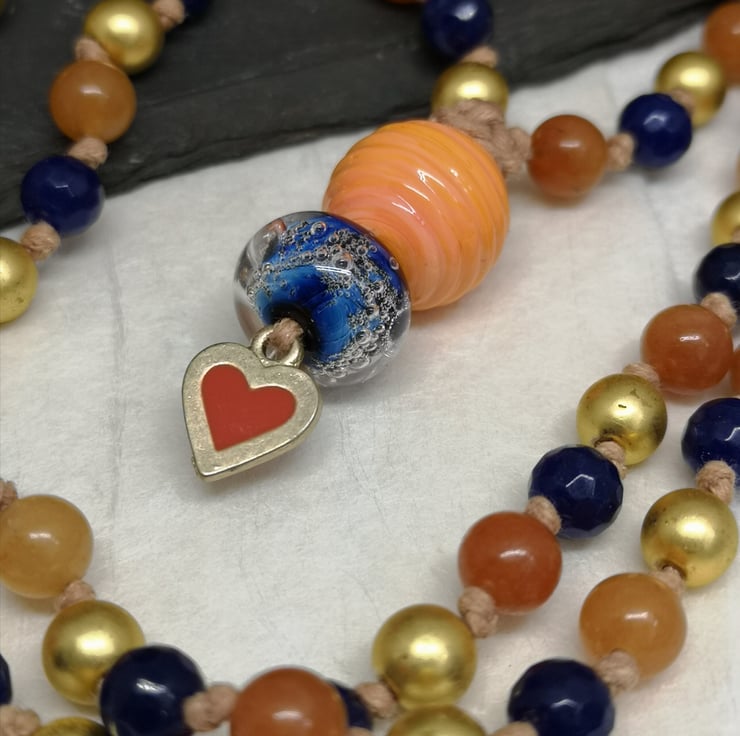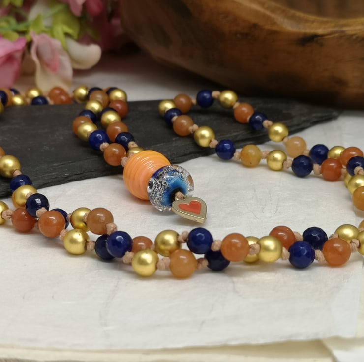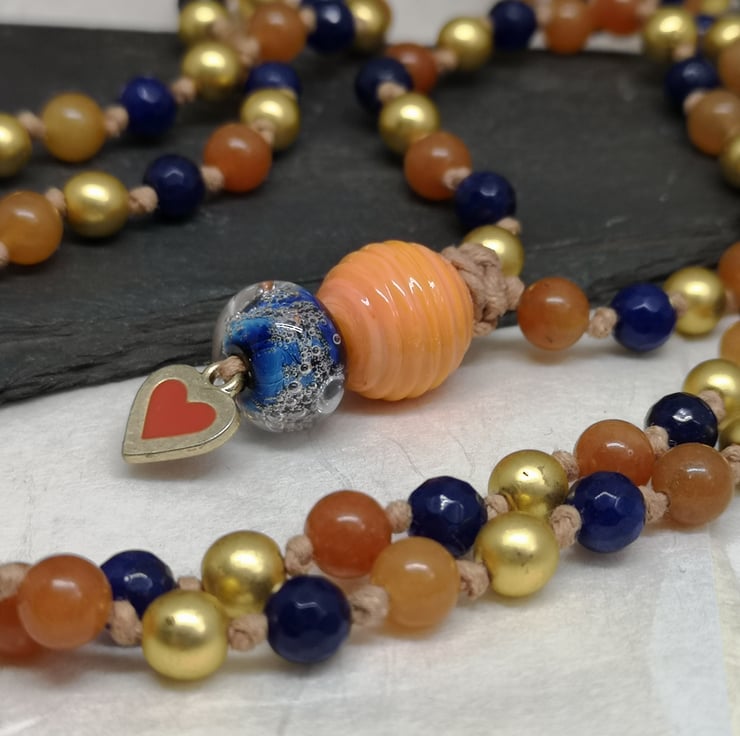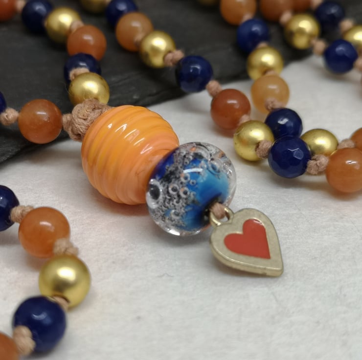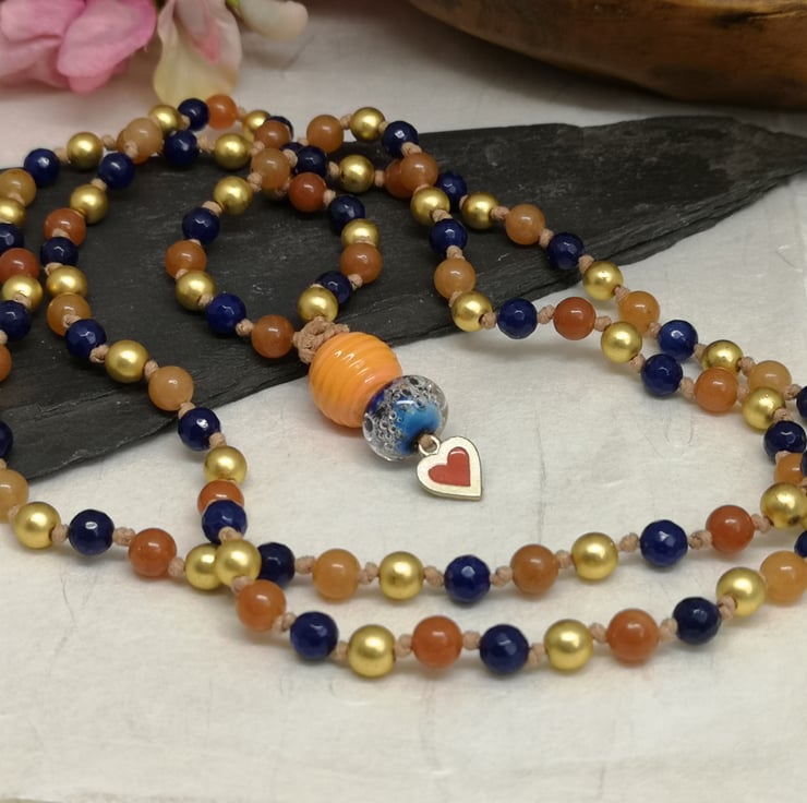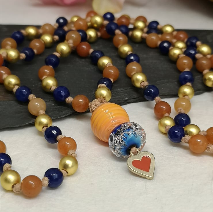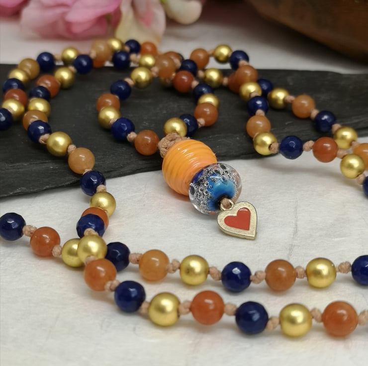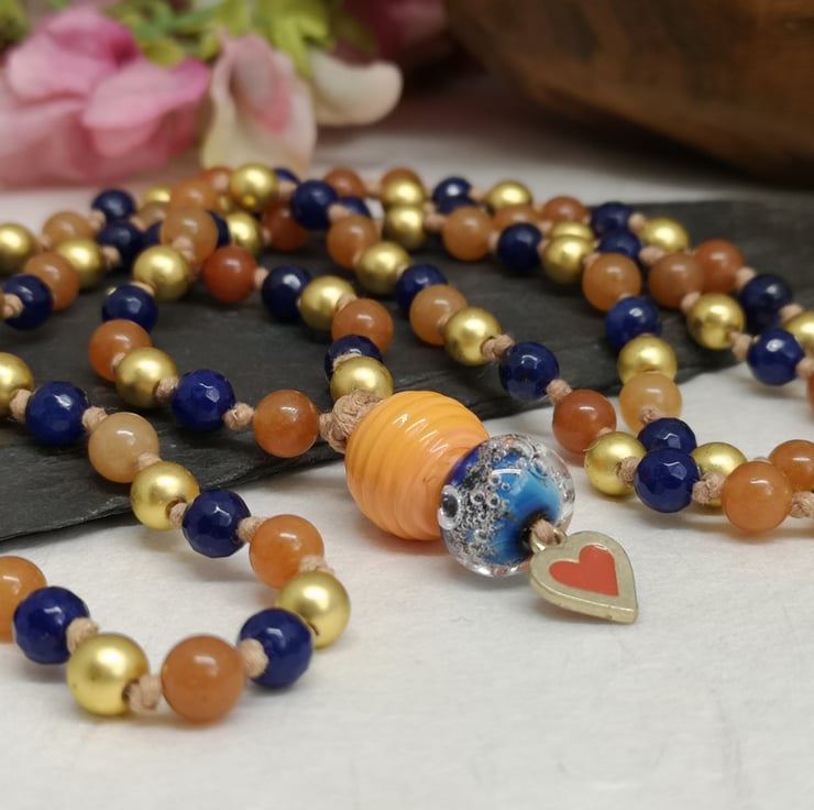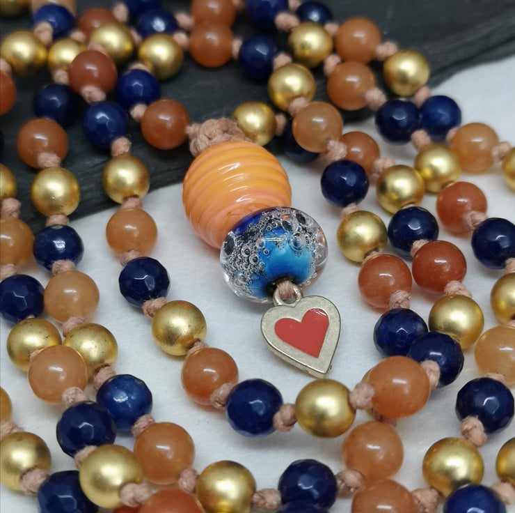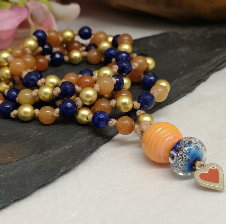 This mala necklace features a blend of 108 gemstone beads made with orange and blue agate accented with shimmering gold hematite. Each bead has been knotted onto tan cotton cord. The centrepiece is two glass lampwork beads and a small heart charm.