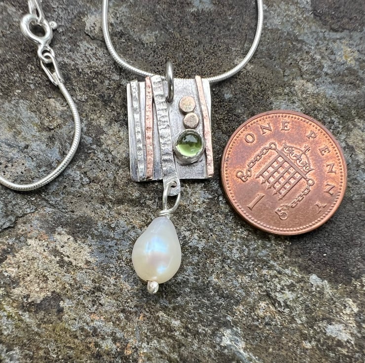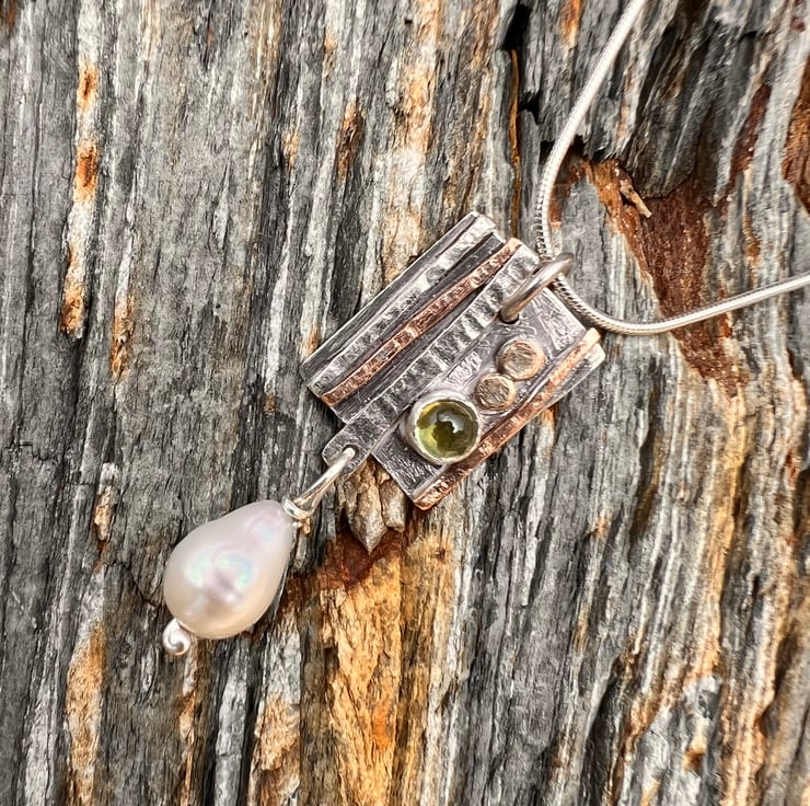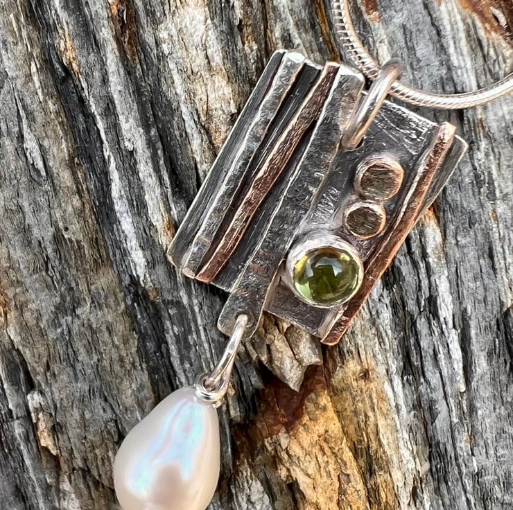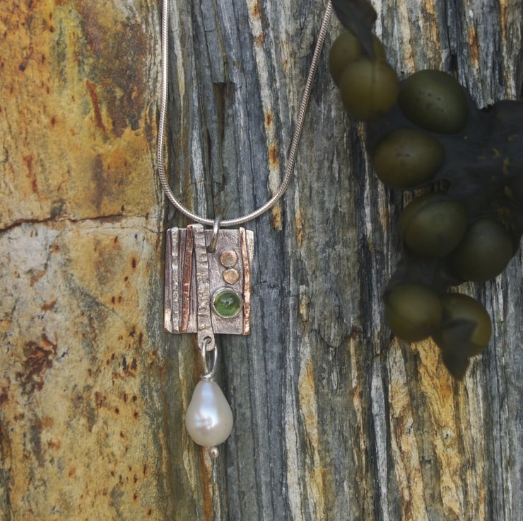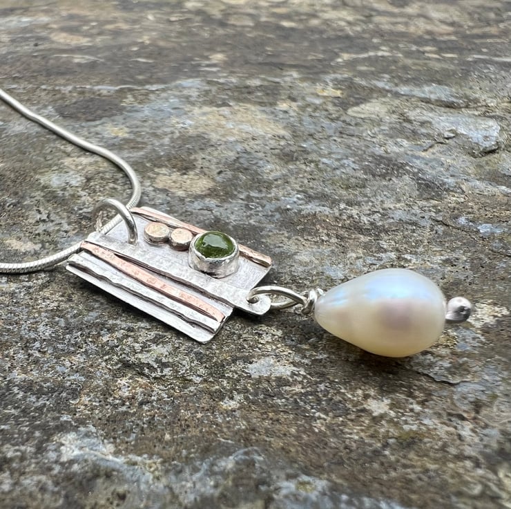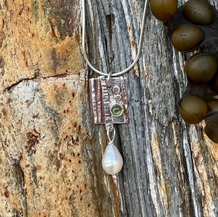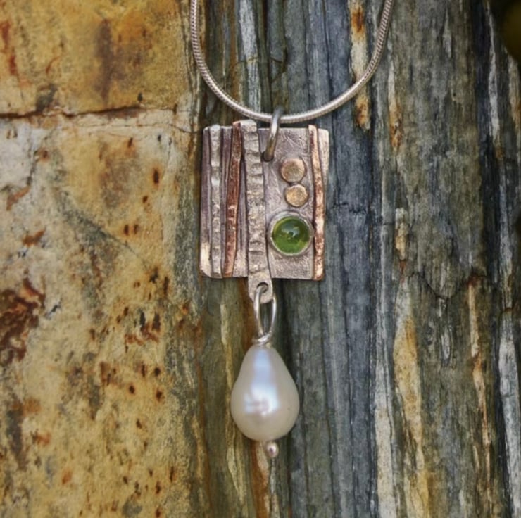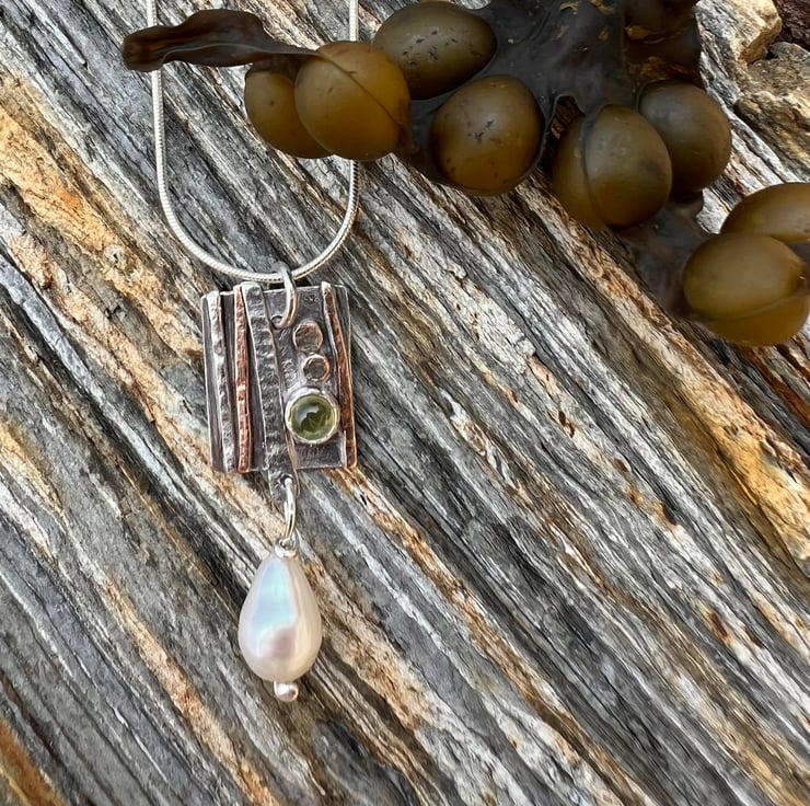 A sterling silver and gold pendant with a large freshwater pearl and Peridot inspired by the strata and rock formations of the west Wales shoreline. The textured decoration is made with hammered sterling silver wire and 9ct rose gold wire . The 'pebbles' are made with circles of yellow 9ct gold.. I have set a fresh green Peridot underneath the gold 'pebbles' like a splash of water and a large freshwater pearl dangles from the central silver textured piece.