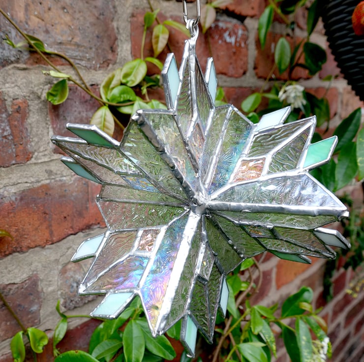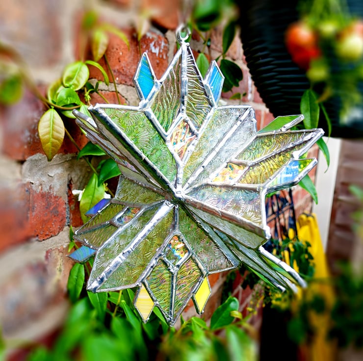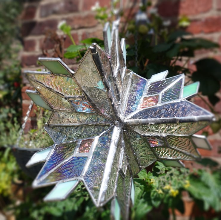 Elevate your home or garden with this captivating Stained and Dichroic Glass Spinner Ornament Hanging Decoration.