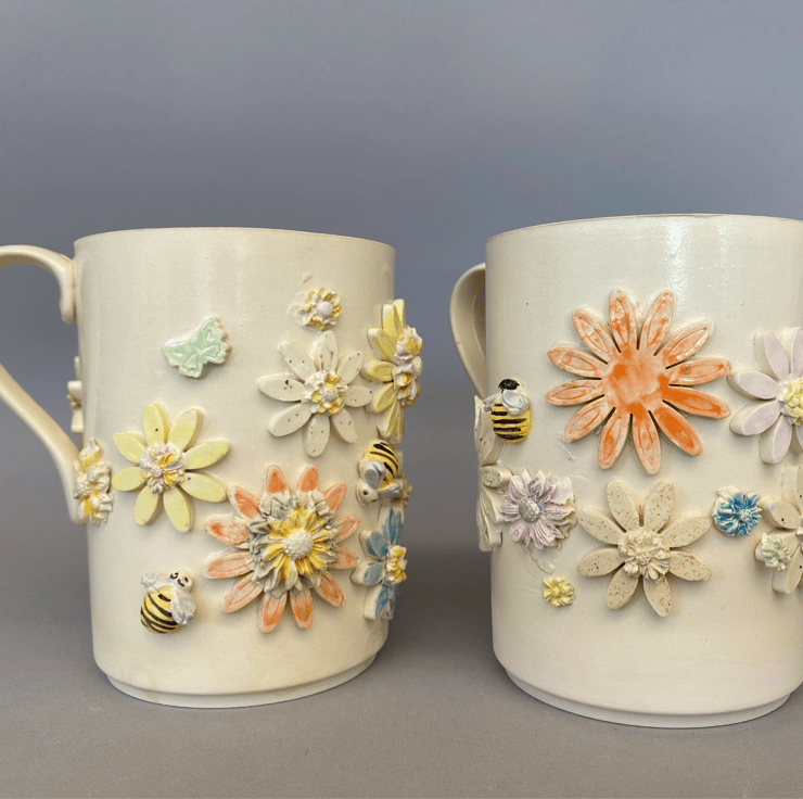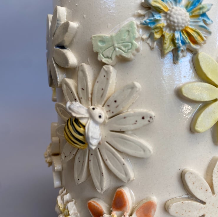 Each decoration is created by hand and individually and added one at a time. Once fired each flower and bee is had painted 3 times to give a vibrant colour.