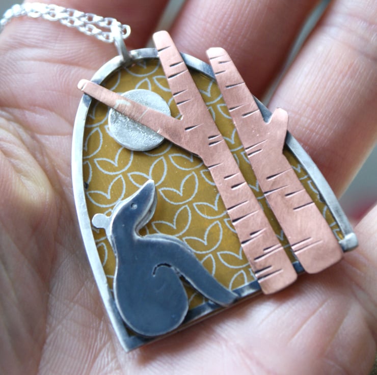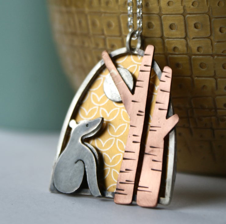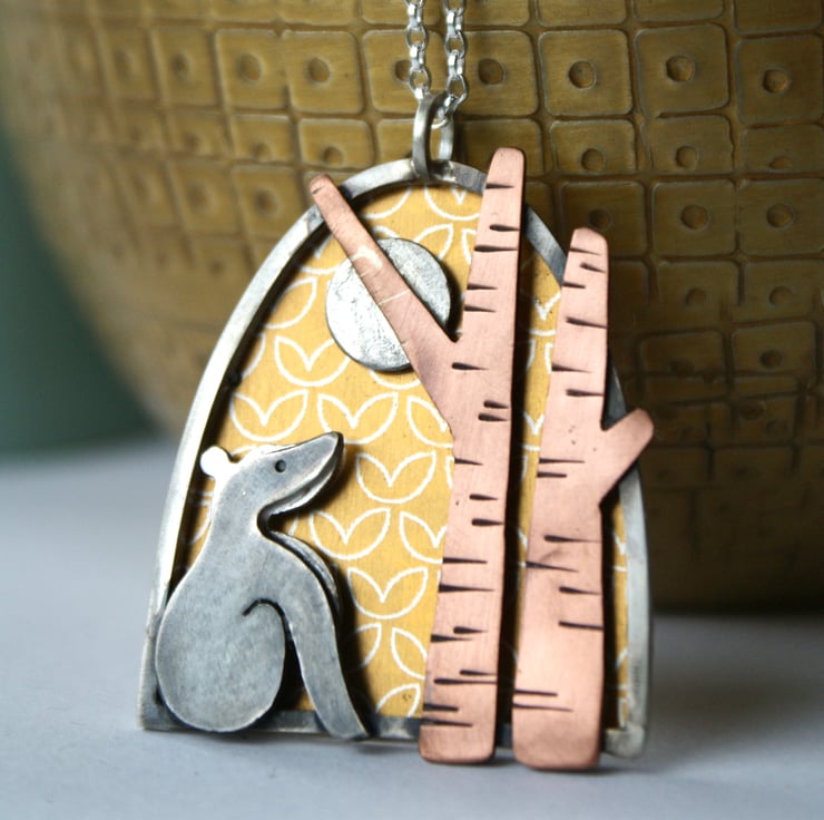 Perfect for any badger lover, this necklace is a little celebration of our woodlands. It features a hand cut sterling silver (part oxidised) badger looking up at a silver moon within some stylised trees. These have been textured, oxidised and polished back to give a satin finish.`This scene is framed by a sterling silver arch and has a mustard yellow background which has been hand crafted from anodised aluminium. Hung from an 18 inch sterling silver chain (please ask if you'd like a different length).
