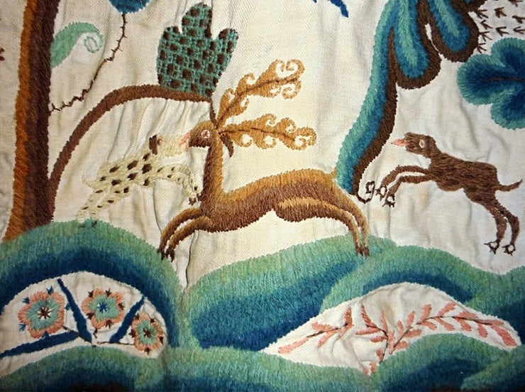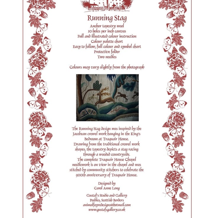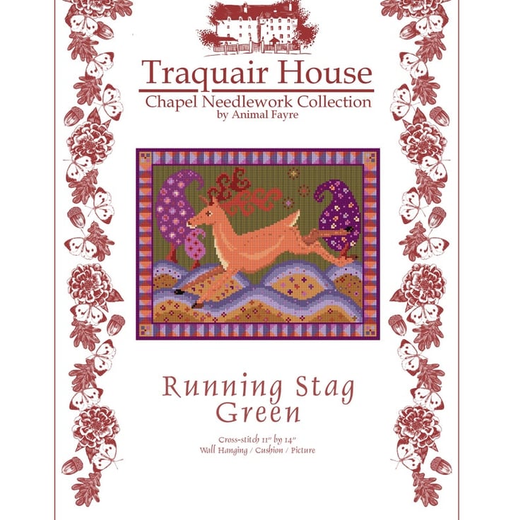 The Running Stag design was inspired by the Crewel Work Hanging depicting a hunt at Traquair House. This design is one of a set of two, the other is Purple Running Stag.