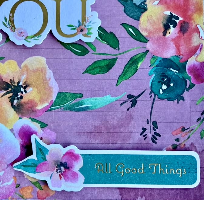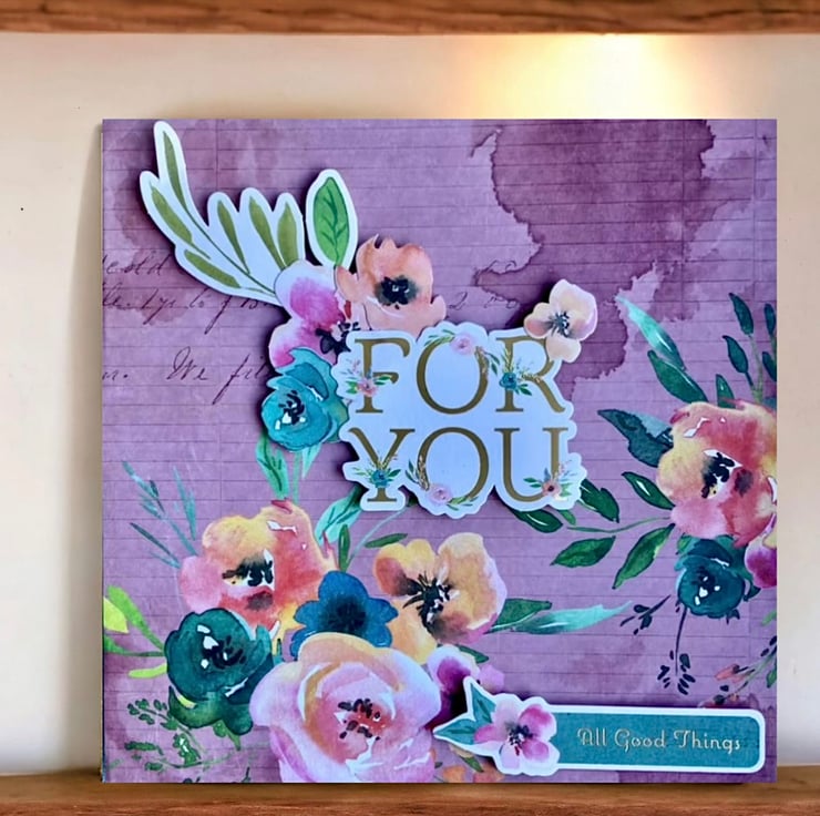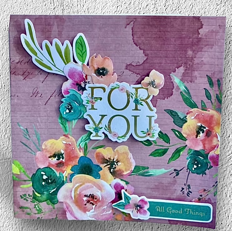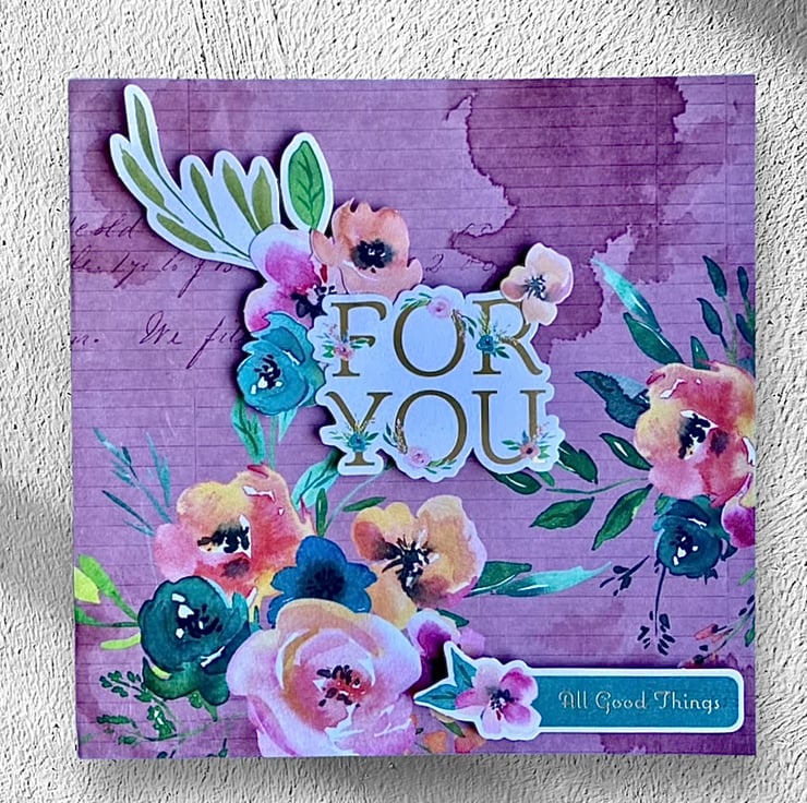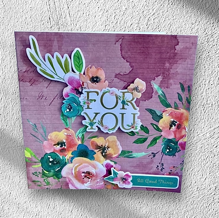 The die-cut floral arrangement in shades of orange, blues, and pinks adds depth and interest, while the 3D words "For You" take it to the next level.