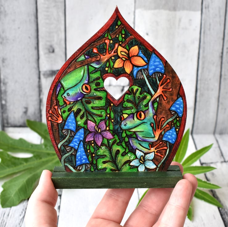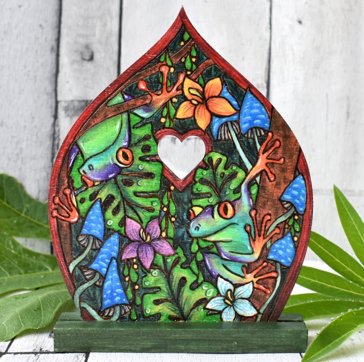 A unique lightweight fairy door, burned using pyrography with a frog and fantasy fungi theme. Decorated with paint and art pencils.