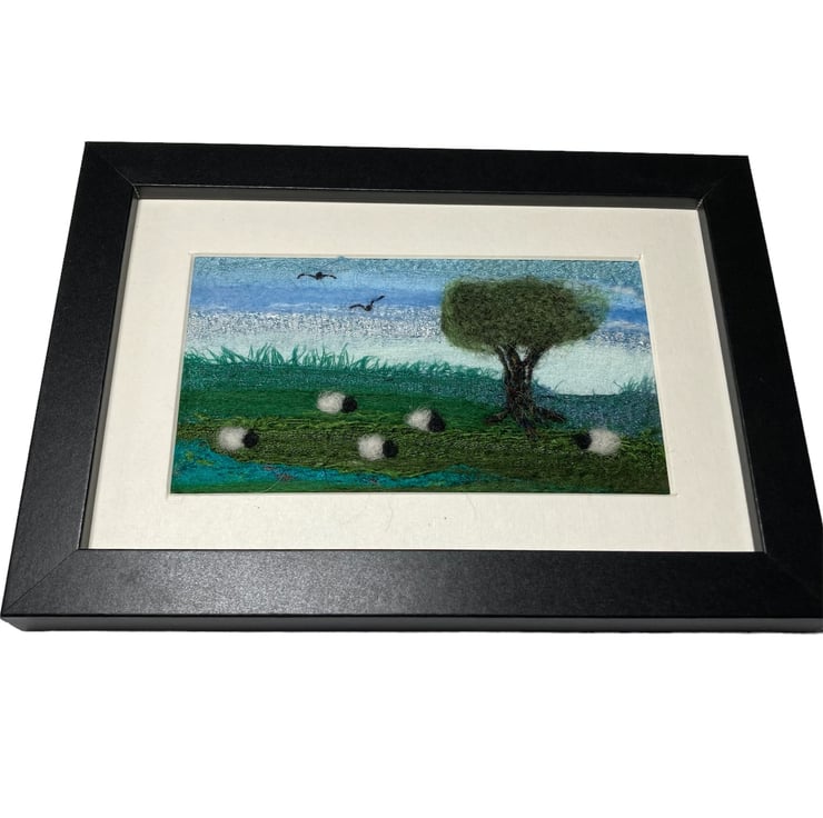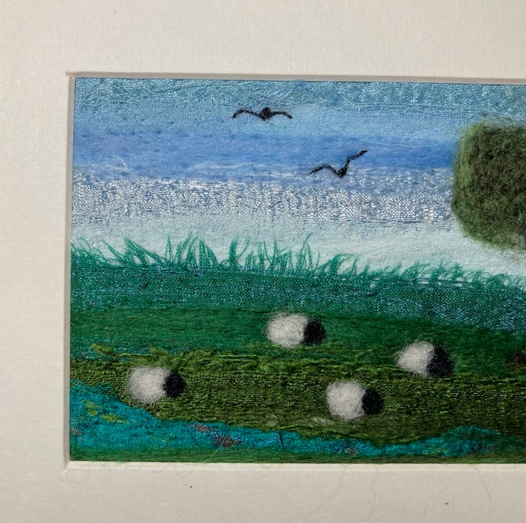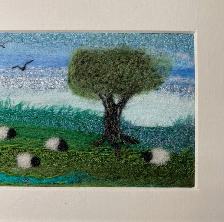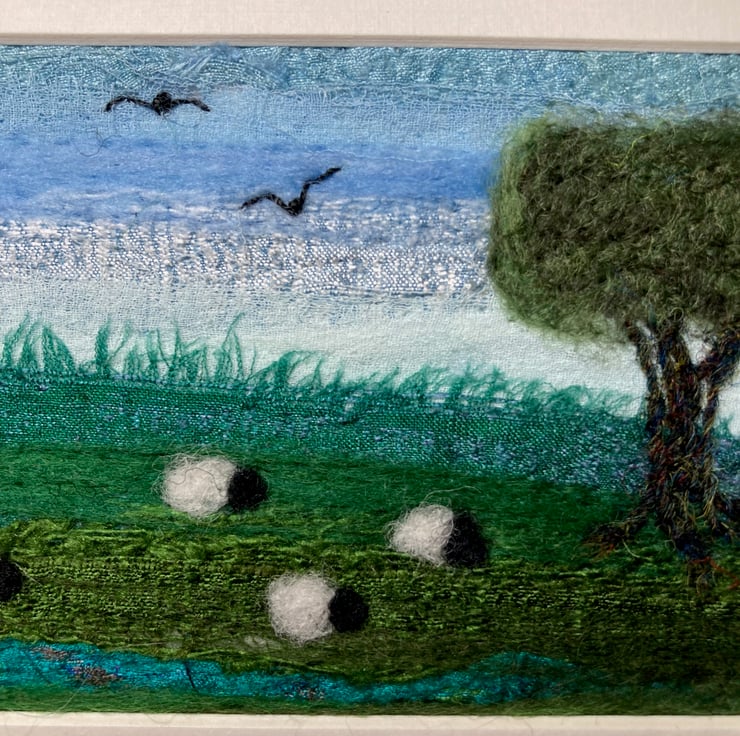 This original textile art picture of sheep grazing beneath a tree has been created by needle felting strips of silk and wool and silk fibres onto a felt background. The needle felting technique eliminates the need for stitching as it uses barbed needles to lock the fibres together. Silk strips form the background and then woollen fibres are added to blend the strips together and create the detail of the sheep and tree. The birds have been added using black thread.