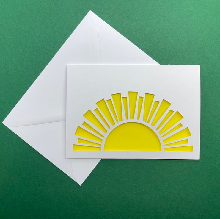 Send this bold, sunny card to your friends or family to brighten up their day! The sun has been cut out of the front of the card and there is a yellow paper insert to show the colour.