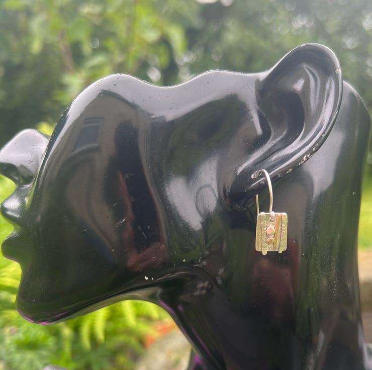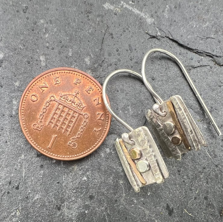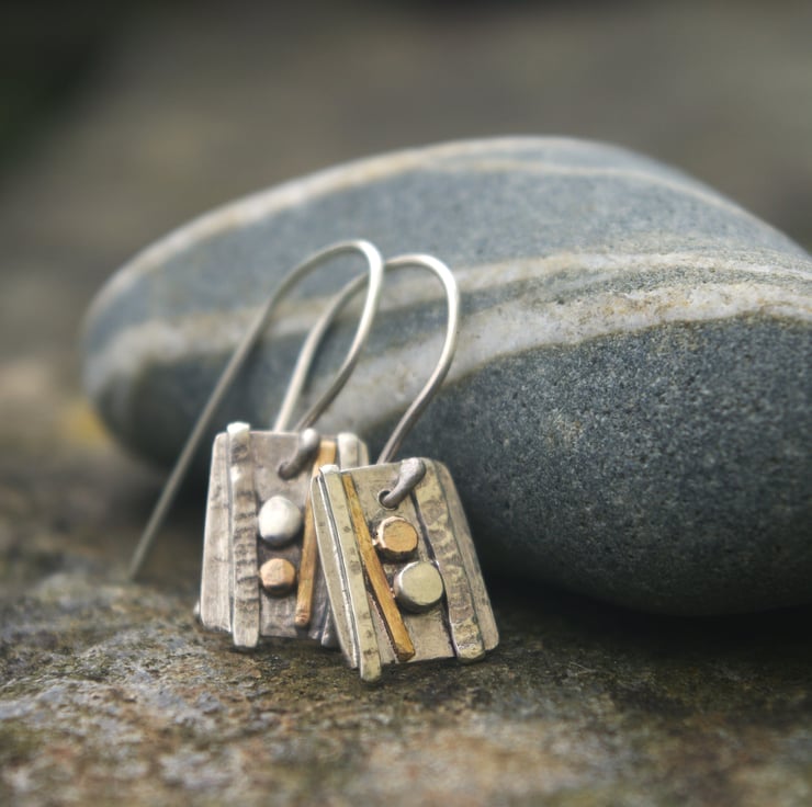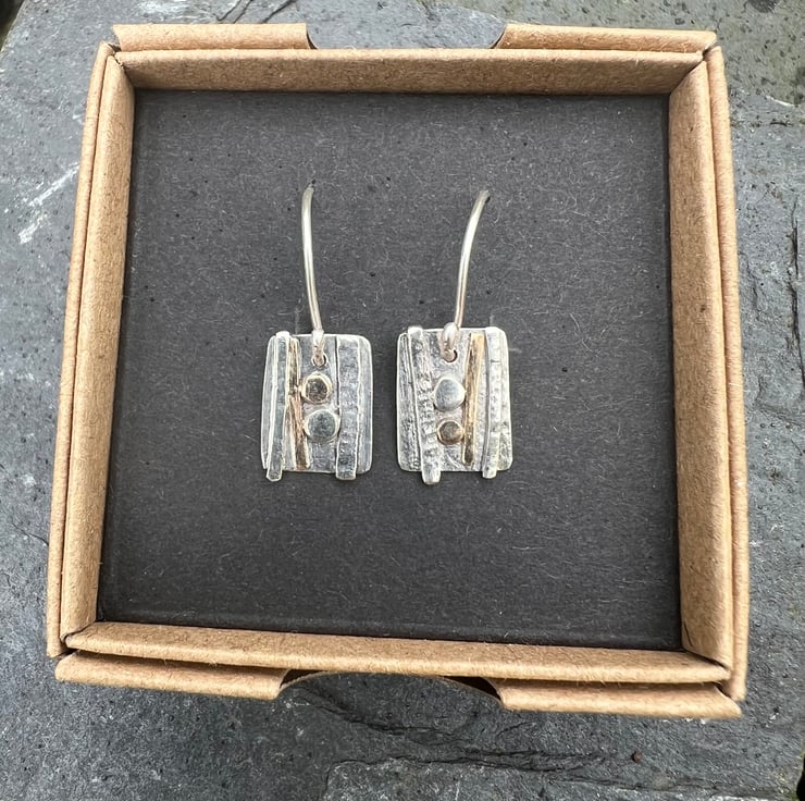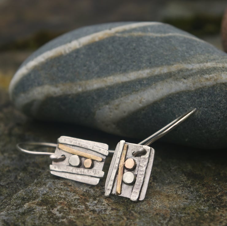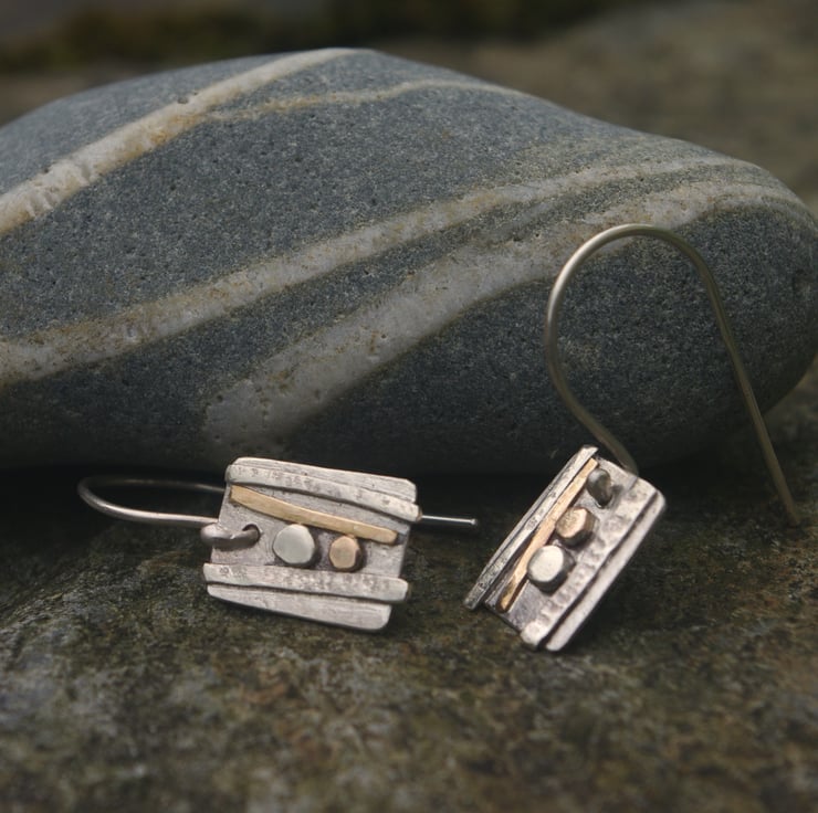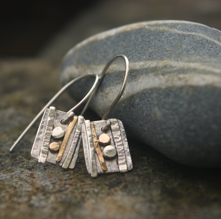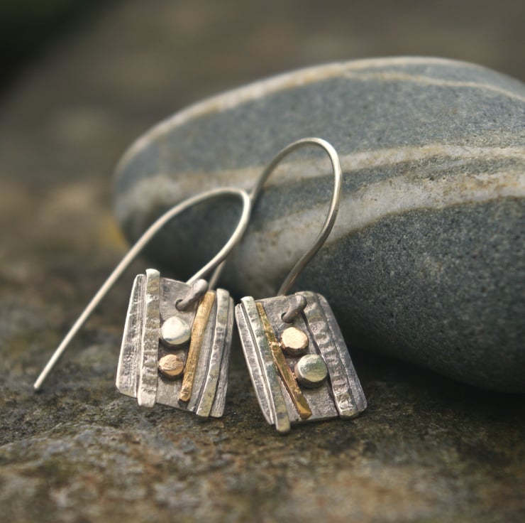 Sterling silver and gold dangle earrings inspired by the strata and rock formations of the west Wales shoreline. They have textured decoration made with hammered sterling silver wire and gold filled wire . The gold filled wire is 12% gold and is more durable than gold plated The 'pebbles' are made with circles of one each of recycled 9ct gold and sterling silver.