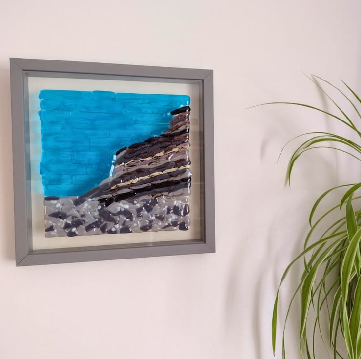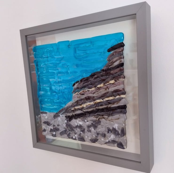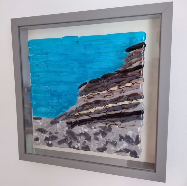 Part of my landscapes series, this fused glass wall art depicts the rocky cliff at Kilve beach with its striations and a beautiful blue sky. The style is semi-abstract, giving an impression of the landscape rather than a lifelike depiction. My method is to take lots of small pieces of glass and arrange them in a slightly haphaward way, bringing the image together gradually like a patchwork. Glass fragments and powders are used to fill any gaps, enhancing the effect. The piece is then fired to over 800 degrees celcius, fusing together all the pieces into one solid picture.