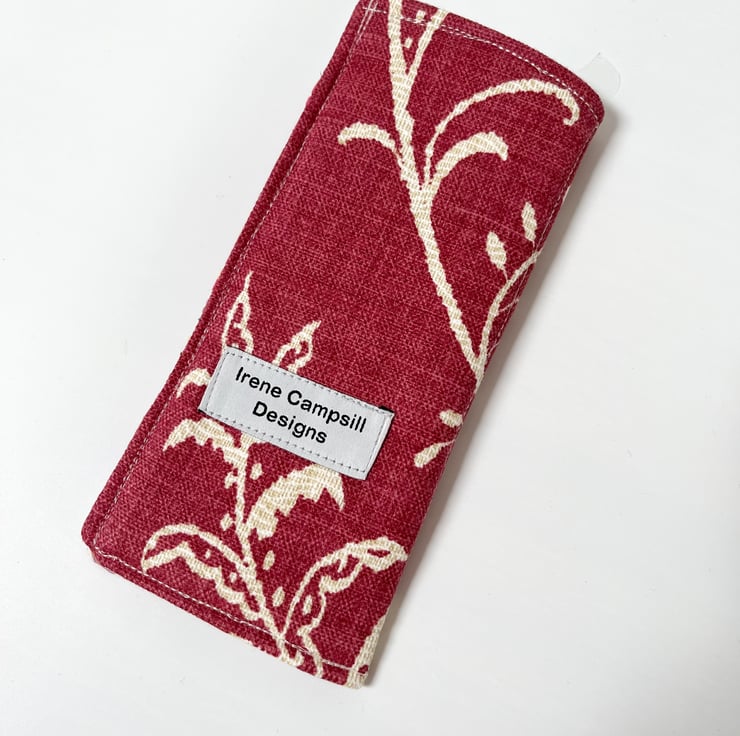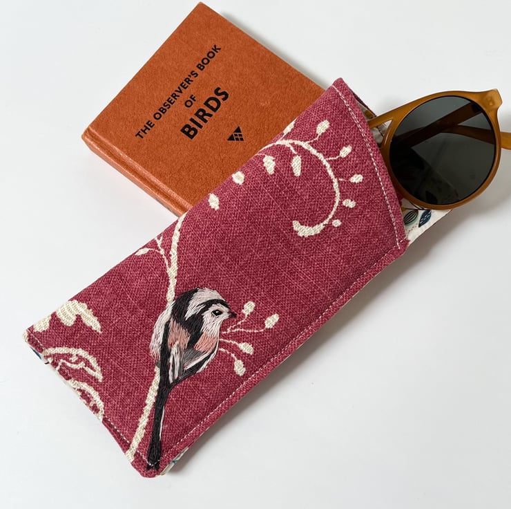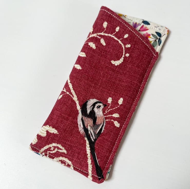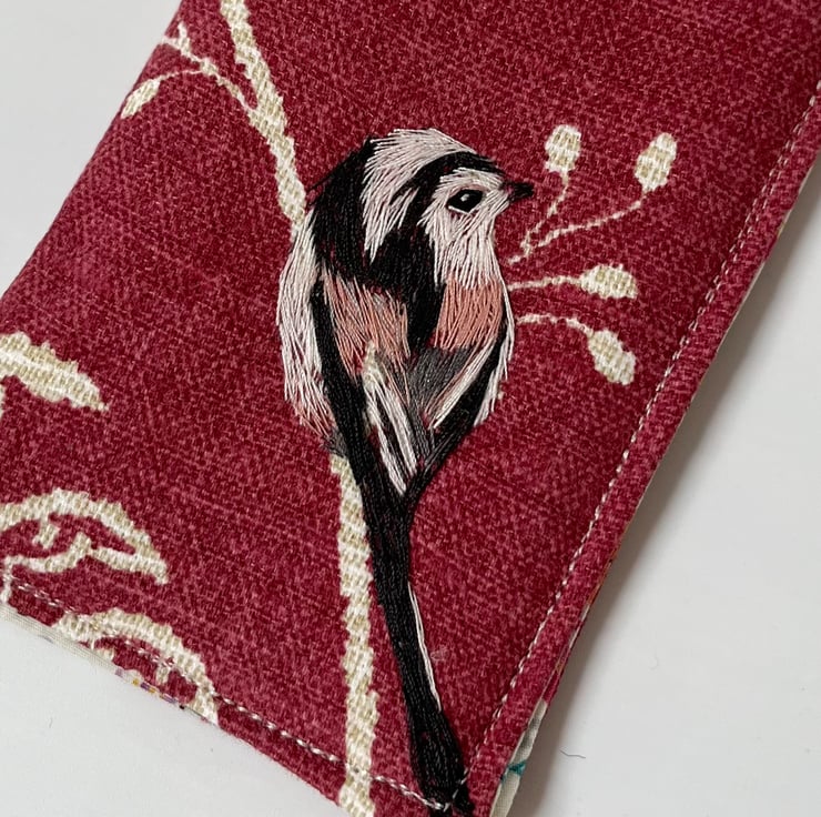 This glasses case has been up cycled from a curtain sample of a burgundy background with cream stems and leaves and has been decorated with an hand embroidery of a long tailed tit perched on one of the stems.