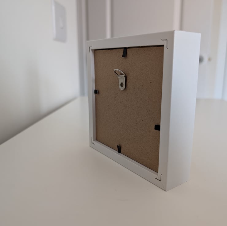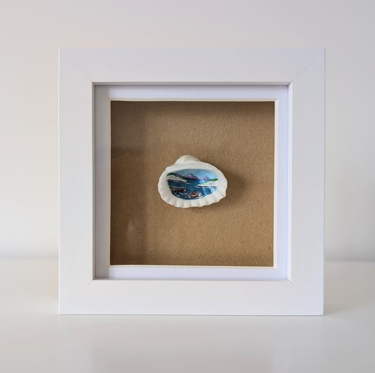 This tiny painting was created on a real shell, painted in acrylics before being varnished with gloss. The painting itself is just 3 x 2.5 cm and sits in a simple white shadow frame, making the overall size 12x12cm.