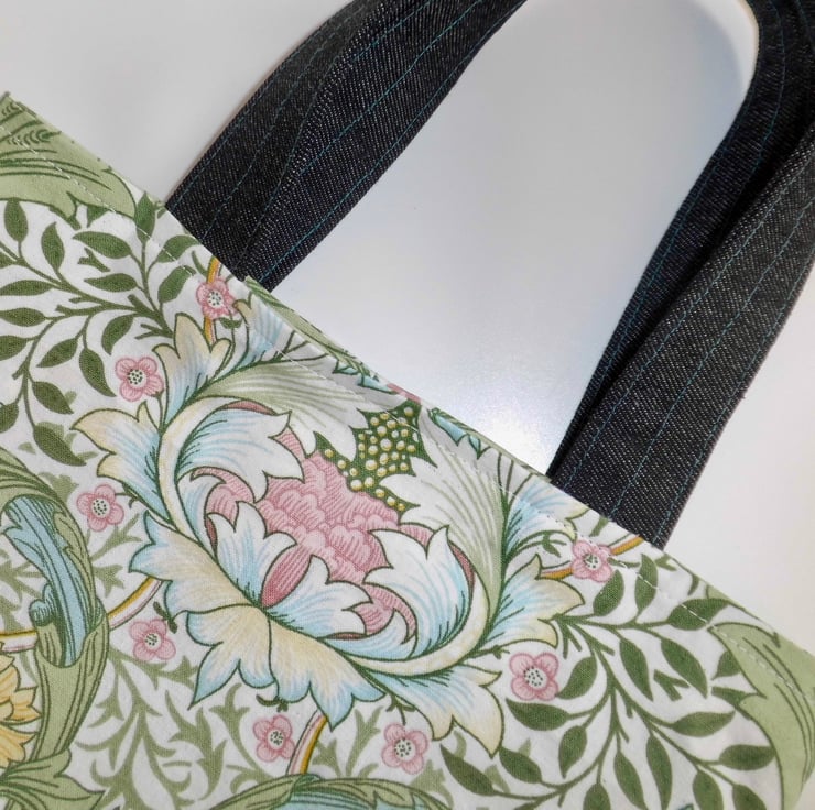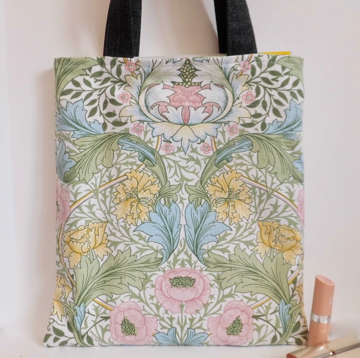 This bag is an upcycled project as the main fabric is a furnishing weight cotton reclaimed from a pair of curtains. It is a William Morris print called 'Myrtle' which has a large pink and yellow flowers with green scrolling leaves and the fabric is in good used condition. It is faced inside at the top with the same fabric to give a professional finish. Lined with plain green cotton fabric.