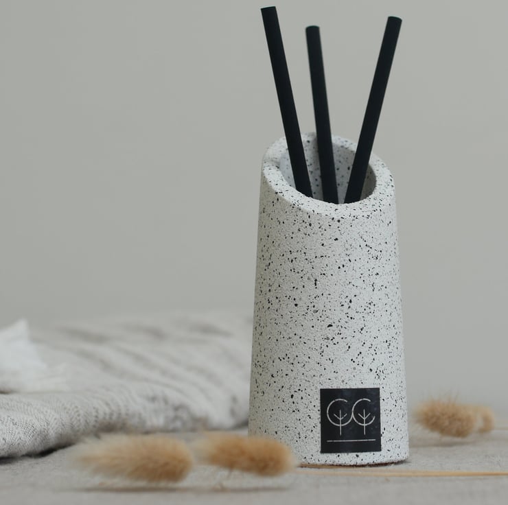 The inspiration for these reed diffusers was primarily the environment I am lucky to live in. In addition to the 219 square miles of woodland, the New Forest also has over 40 miles of coastline with flora and numerous aromas unique to the area. In essence, this is what I have tried to capture. After much development, I designed a reusable system that was fully recyclable without having to manually remove candle wax or decant fragrance oils, therefore avoiding spillages or damage. The stoneware is made with a low-emission, sustainable natural material that is durable and reusable.
