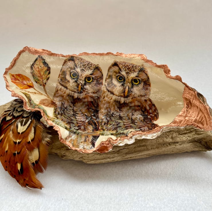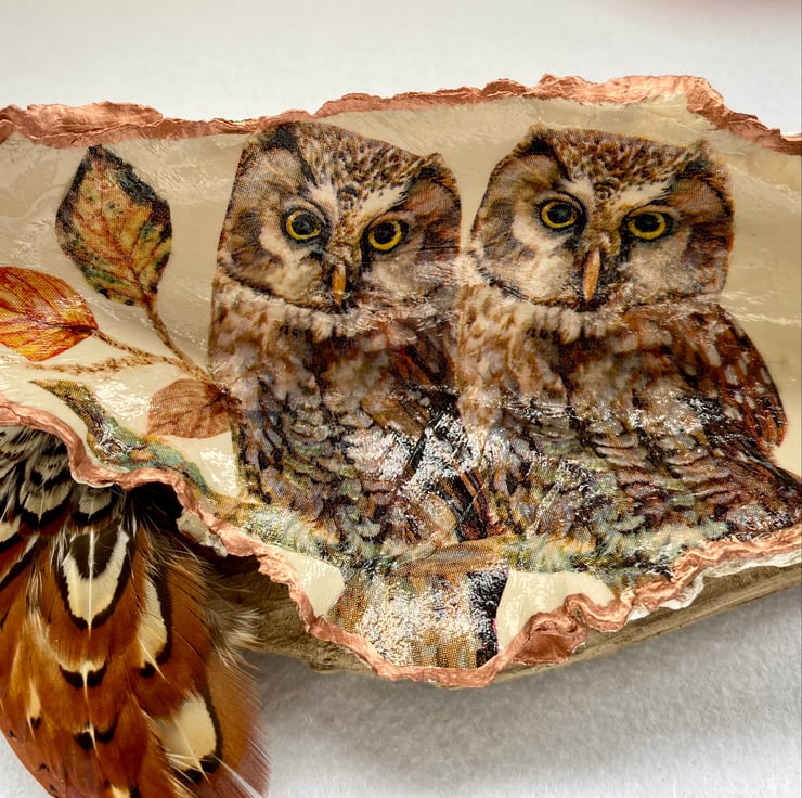 Fabulous extra large shell, a lovely deep shape too. I have hand decorated and decoupaged this shell with two beautiful owls, I think they are tawnies sitting on a branch. The depth of this shell has allowed me to set them deep into the shell, you almost want to ruffle their beautiful feathers. Lovely soft natural tones that are complimented by the pretty bronze edging. A stunning present for a bird lover.