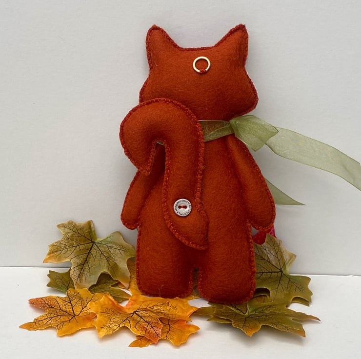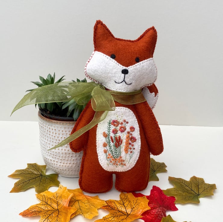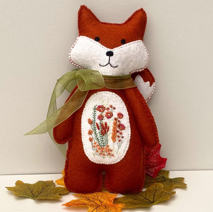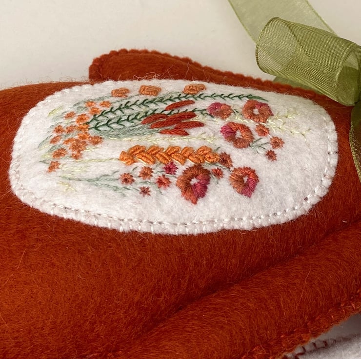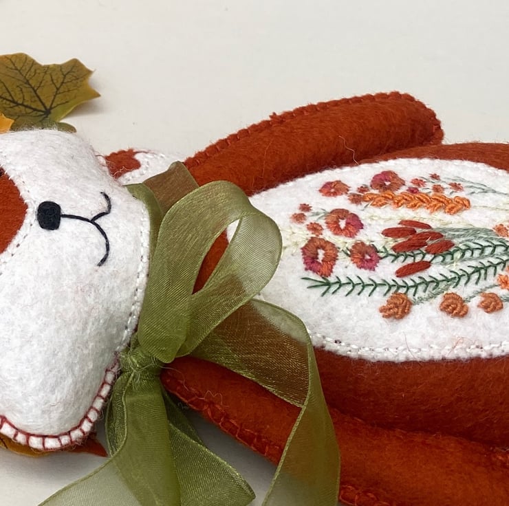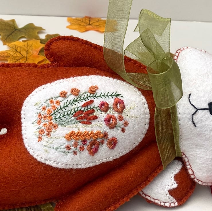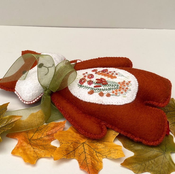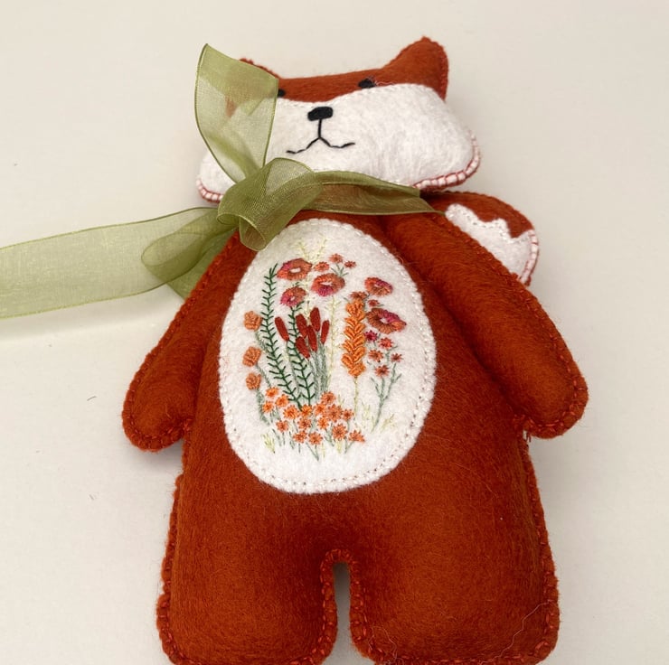 Designed as a decorative embroidered keepsake he was sewn from 100% wool felt in deep paprika, a lovely rich fox colour with snow white contrast to his face and body. Hand embroidered with floral details in colours to compliment and match, terracotta, paprika, russett, deep oranges and greens.