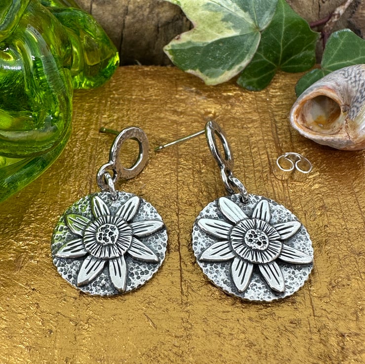 Inspired by nature, I have made these flower earrings in sterling silver. With a stud fastening, the flower discs will dangle nicely to catch the light.