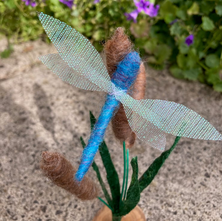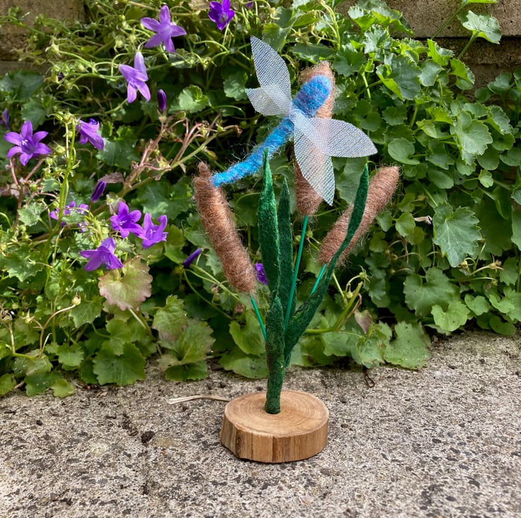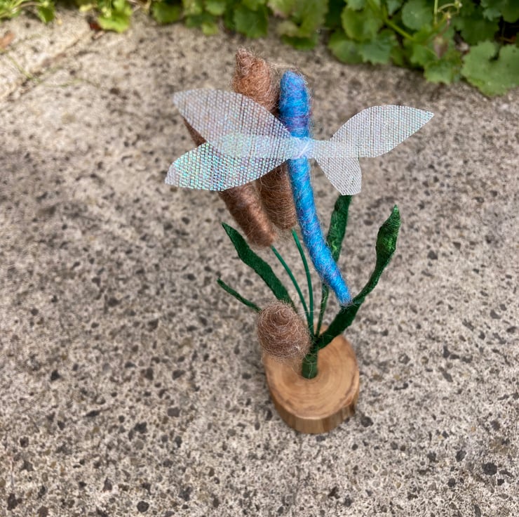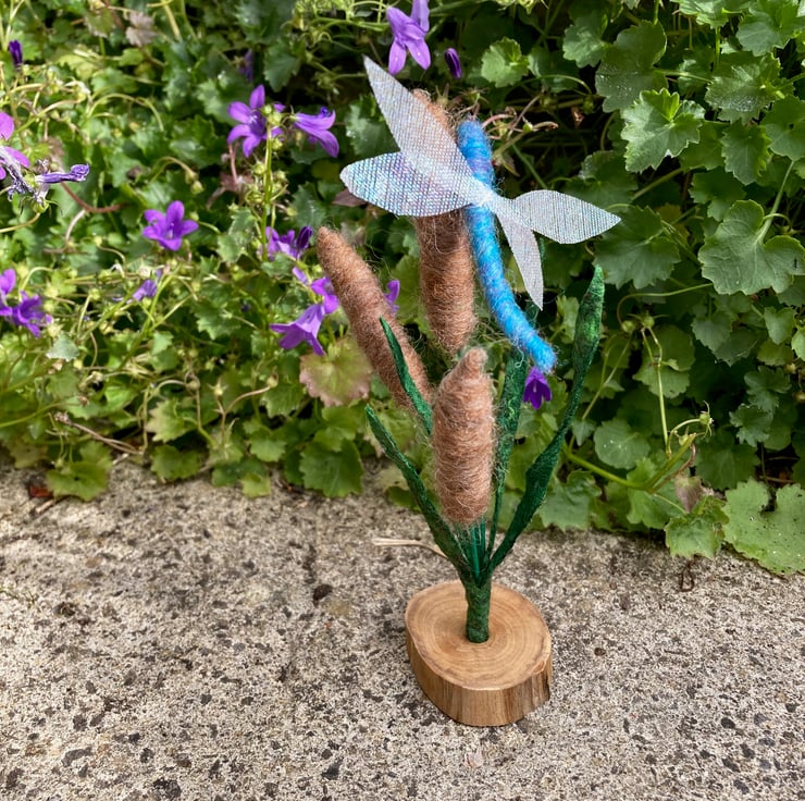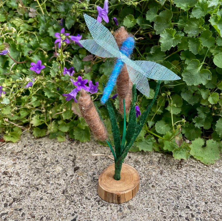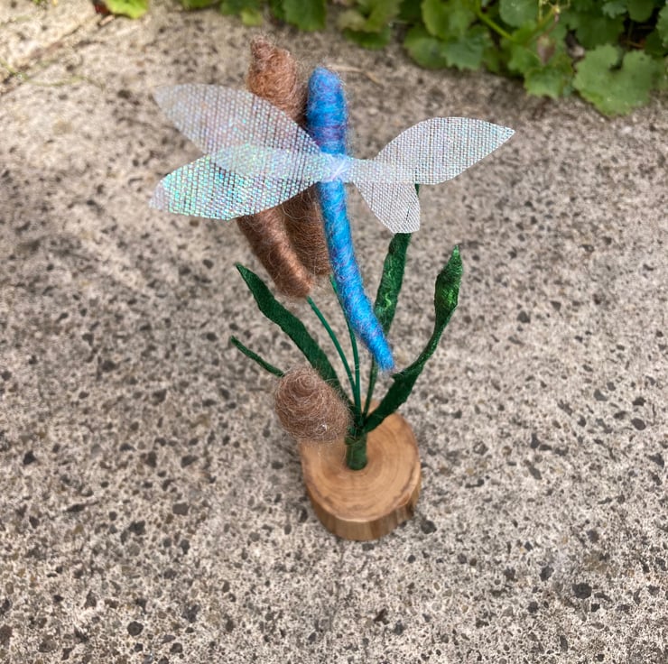 A pretty blue dragonfly with irridescent gauze wings flying among the bulrushes. This ornament consists of 3 needle felted bulrushes surrounded by green foliage cut from a piece of handmade stiffened felt wiith silk highlights. The needle felted dragonfly has been mounted on the central bulrush. The bulrushes and dragonfly are all formed over a wire base allowing them to be gently posed as required. The resulting assembly is mounted in a small rustic wooden slice.