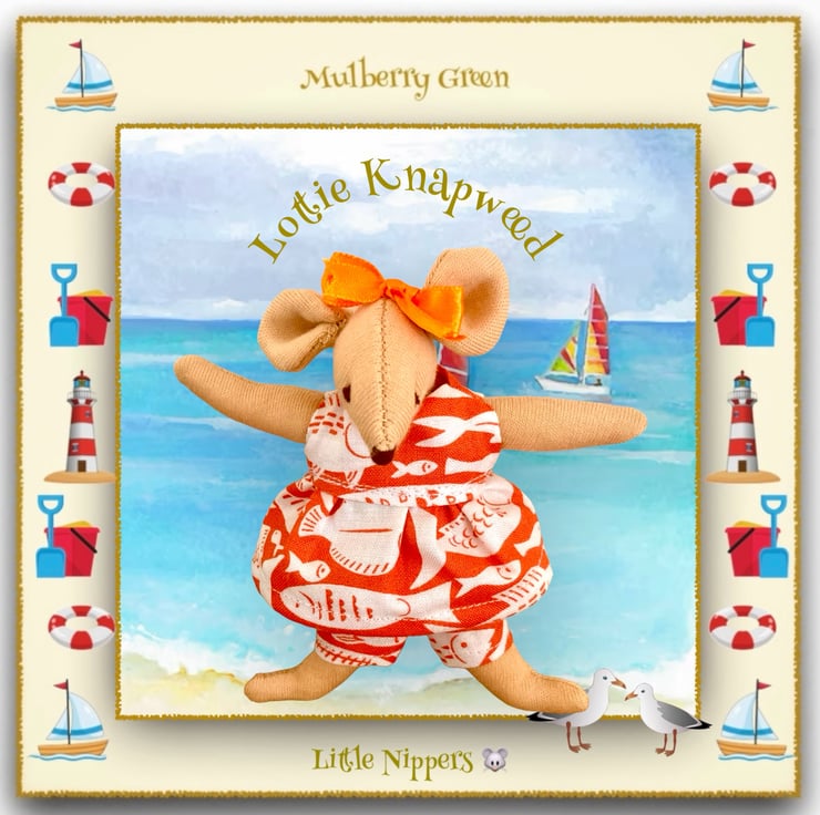 Lottie Knapweed, dressed for the seaside in her cute fishy print top and matching shorts, is one of the Little Nippers - tiny mice who live in a maze of tunnels underneath the barn at Mulberry Farm. All of the Little Nippers are named after herbs or meadow flowers. The little mouse clothes are all removable and other clothes can be purchased - all of the clothes in the Little Nippers section of my shop are made specially to fit my mice. The Little Nippers are 13cm tall.