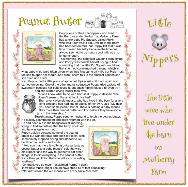 Little Nippers are a whole community of tiny wood mice, who live in a maze of little burrows and passages underneath the floor of the barn at Mulberry Farm. They are sometimes very hard to spot and Maisy and her friends rarely see them - but they are always there. The tiny mice all have their own cosy little cottages inside the burrows and work very hard in the fields, gathering seeds and berries, tiny fruits and bits of grain to take back to the burrows to be made into food. They even have their own little barn shops, where they can share the things they find in the fields and get the food they need to look after their families. They are a very happy little community who all take care of each other. There are also baby Nippers, who are called Pip Squeaks - these are very small and are not removable from their sleeping bags.