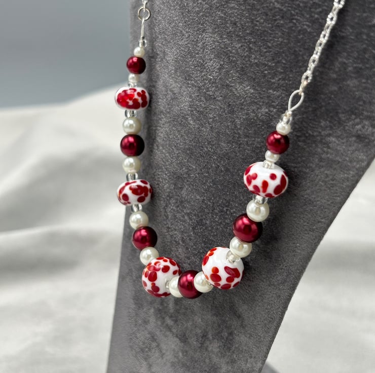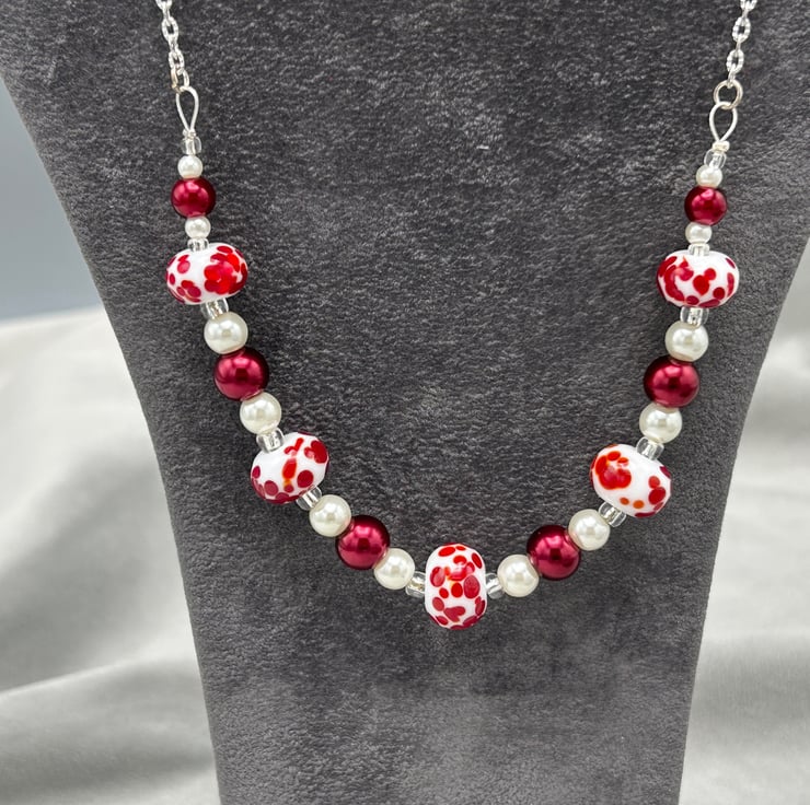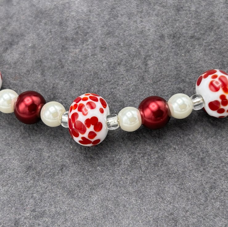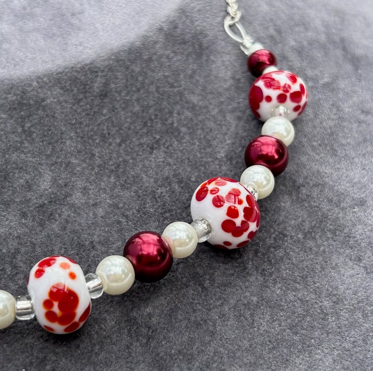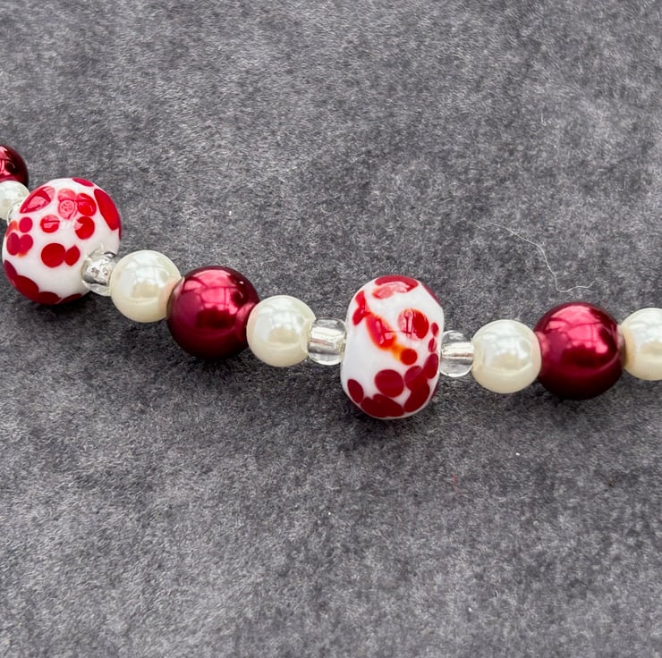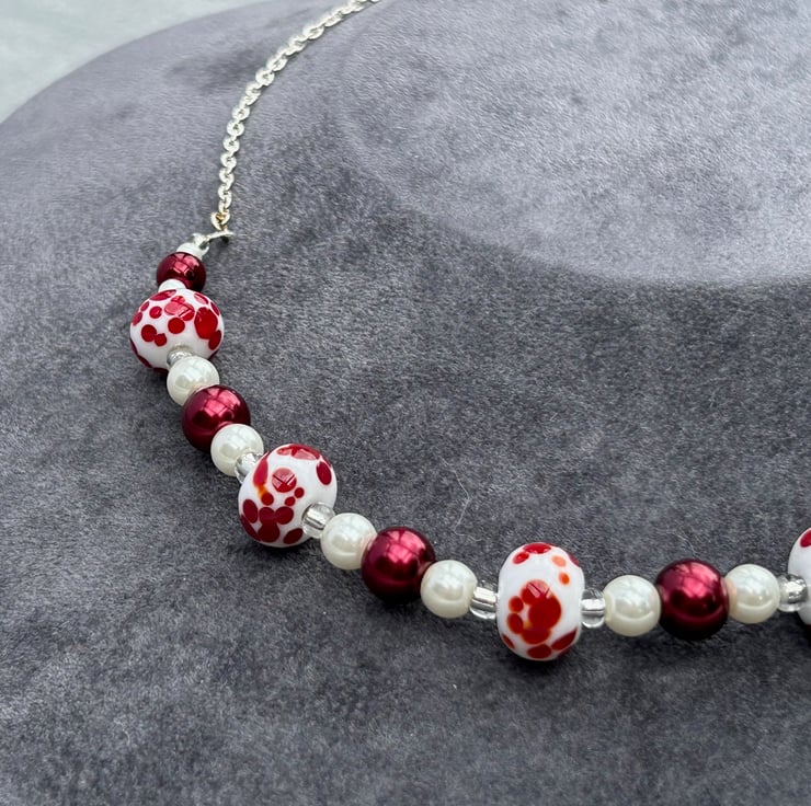 I have made 5 cherry red spotted on white lampwork glass beads for this vibrant necklace design and combined it with glass pearls in red and in white to complement the glass beads. In addition there are silver lined crystal seed beads.