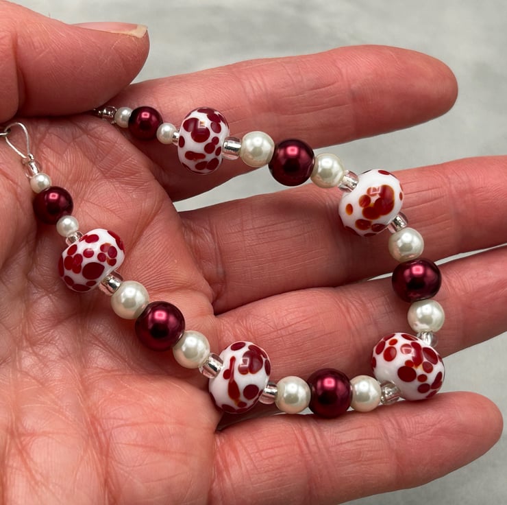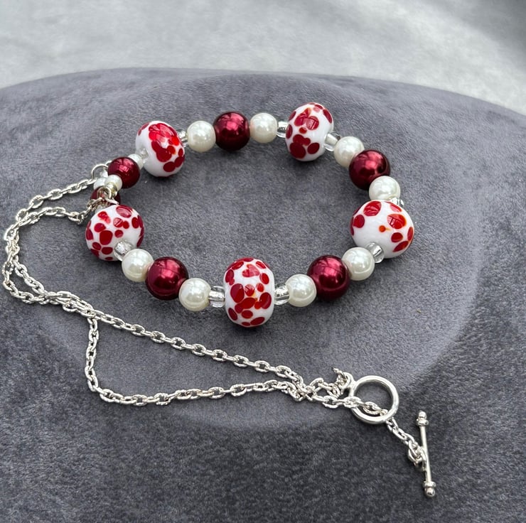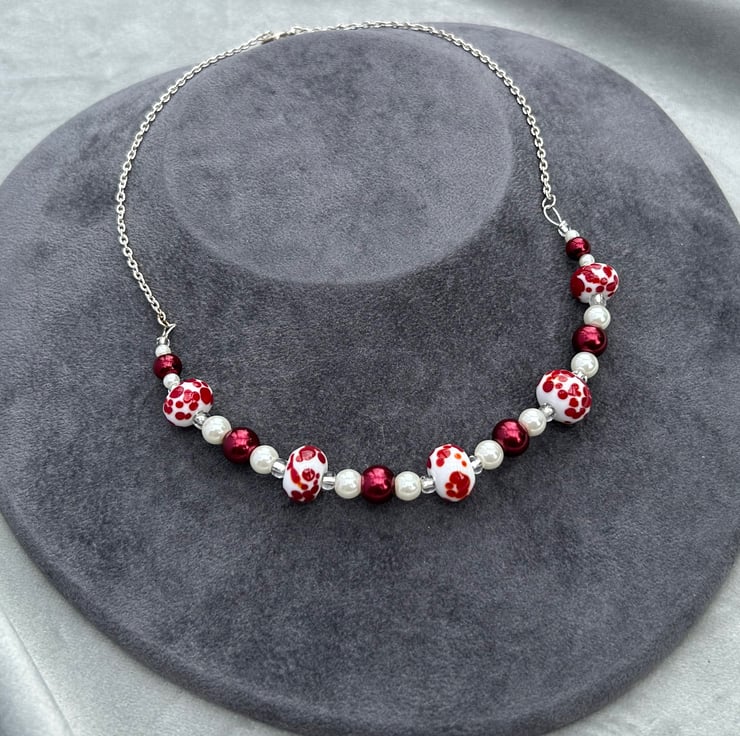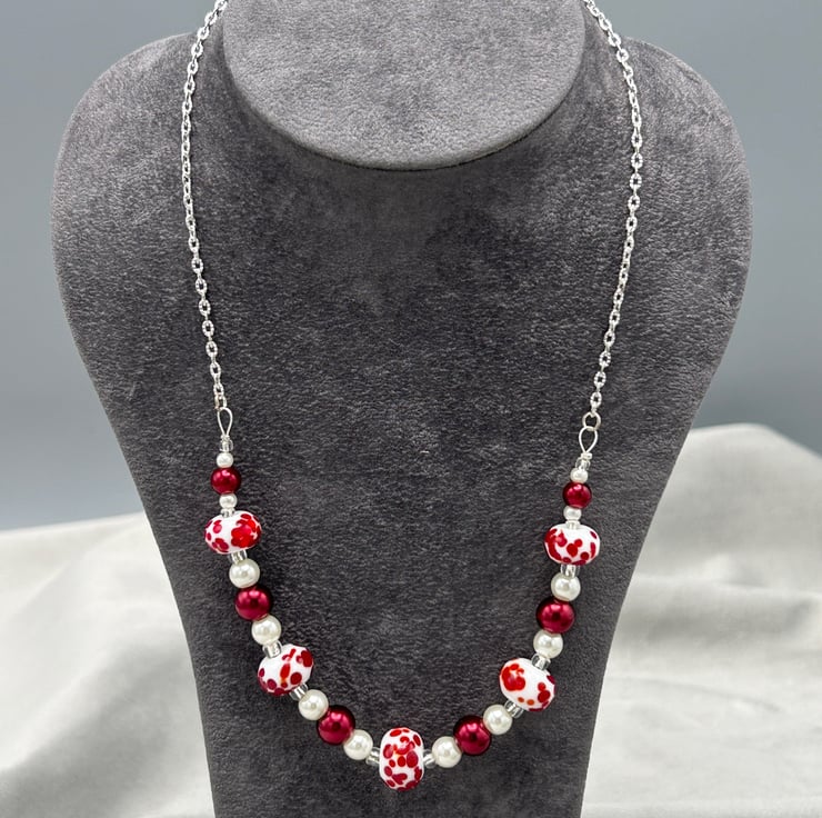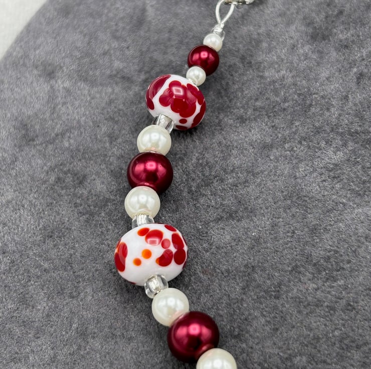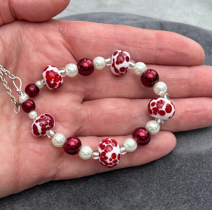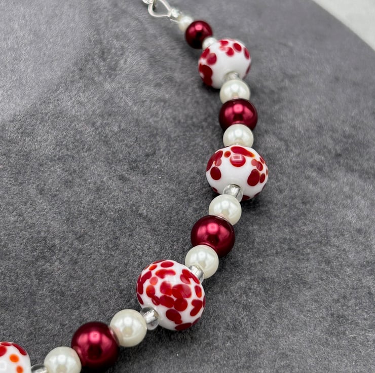I have made 5 cherry red spotted on white lampwork glass beads for this vibrant necklace design and combined it with glass pearls in red and in white to complement the glass beads. In addition there are silver lined crystal seed beads.