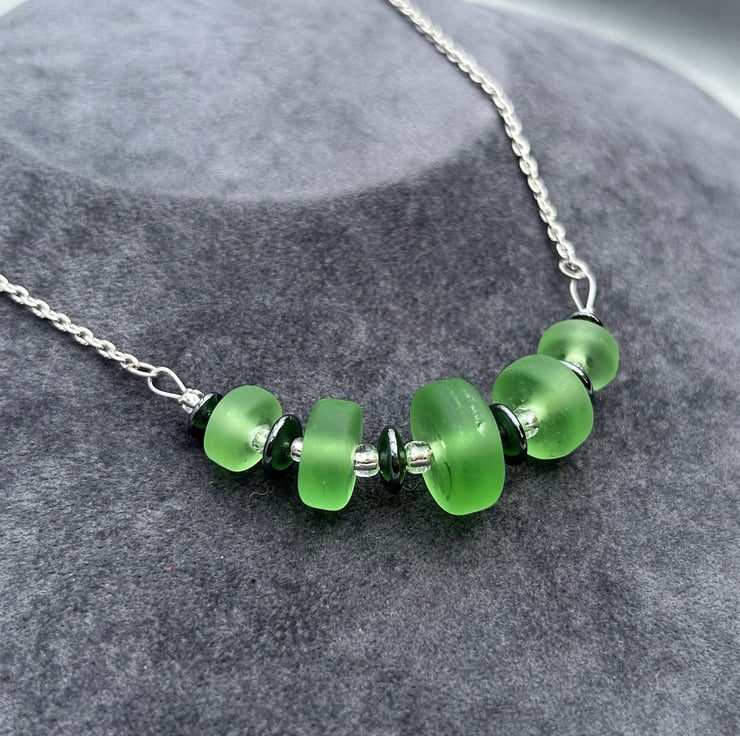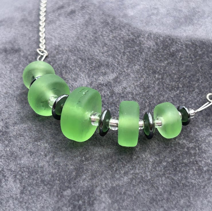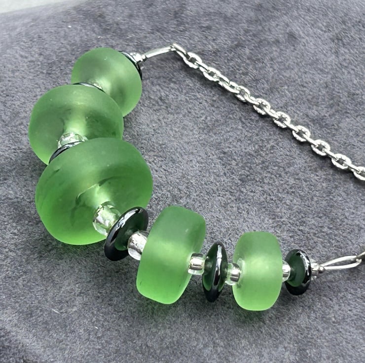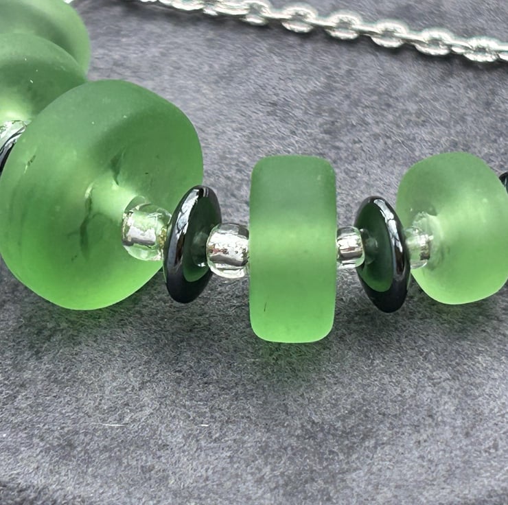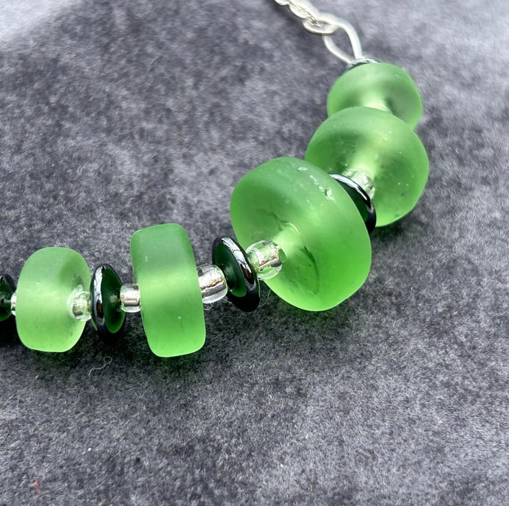 I love sea glass style beads; these stylish handmade green beads seem to glow from within their velvety centres. The beads I have created are moulded into graduated disc shapes whilst the glass is molten. Once cooled and cleaned, they were chemically etched to give a sea glass effect, some areas on the bead have been left un-etched resulting in a more organic design, nothing is perfect or uniform in my glassy world!