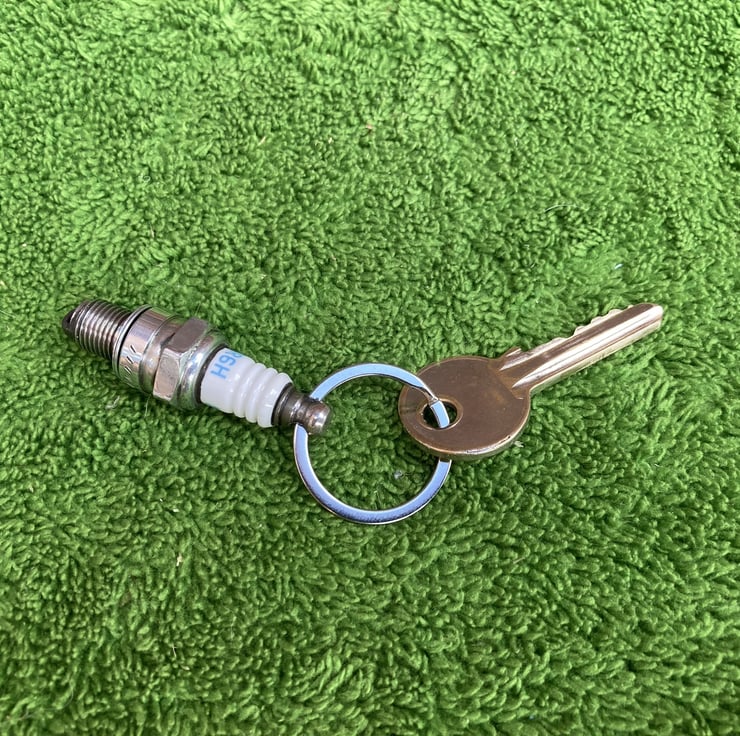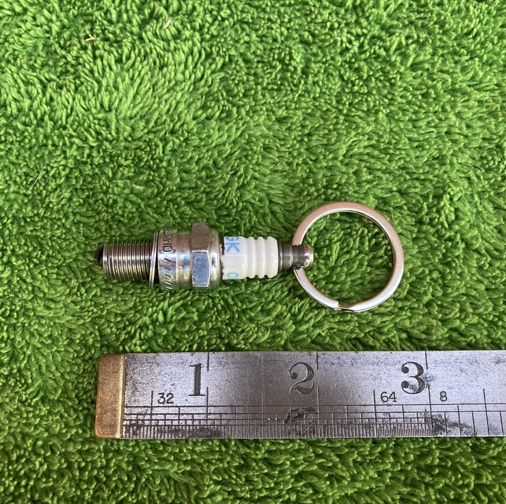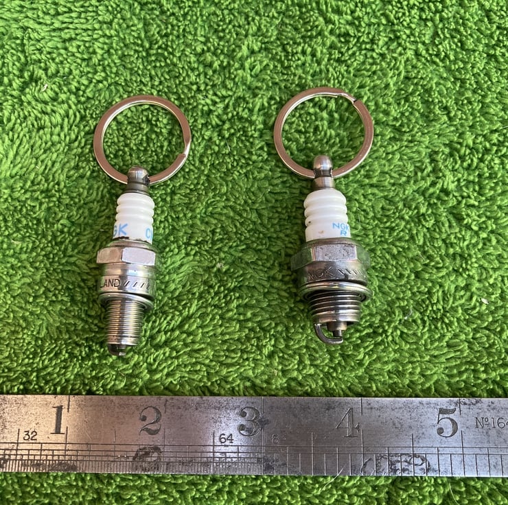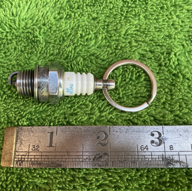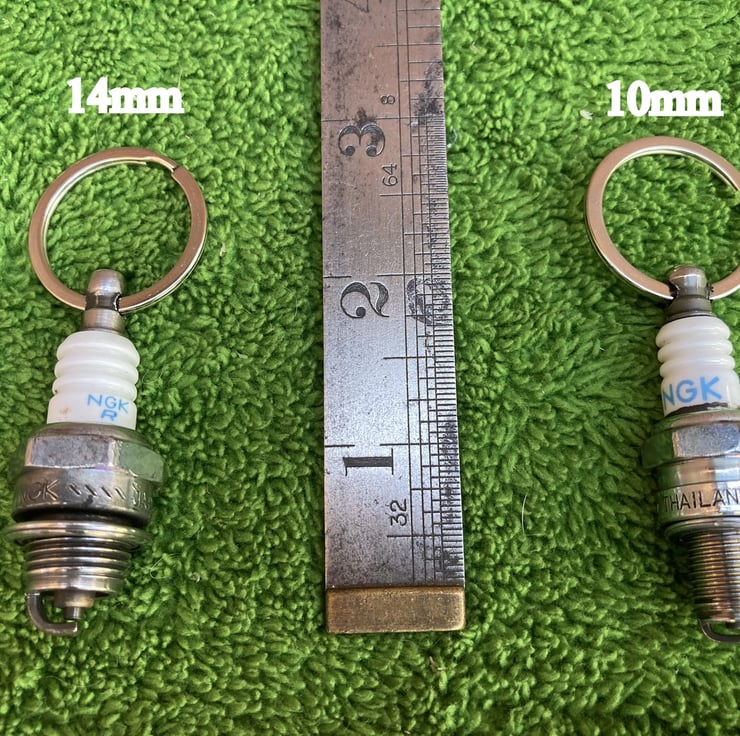 A novel key ring or bag charm made from a used chainsaw size spark plug, an ideal gift for a motor enthusiast. The chainsaw spark plugs are much smaller (and lighter!) than standard sized plugs so are well suited to this use. I have drilled through the contact end of the spark plug to accommodate a 28mm x 3mm split key ring and cleaned and polished the plug body. There are two sizes available (at the same price), with 10mm or 14mm threads, both are the same length, about 2 inches/50mm spark plug length but the 14mm size are a little chunkier than the 10mm ones.