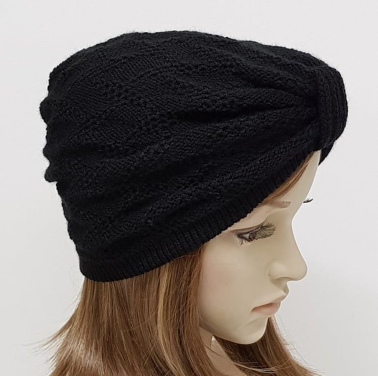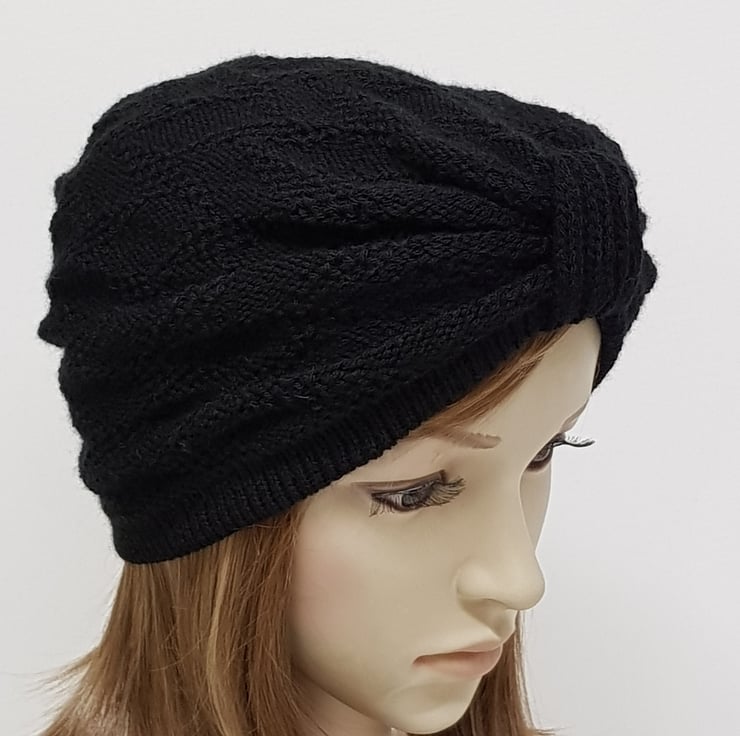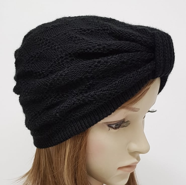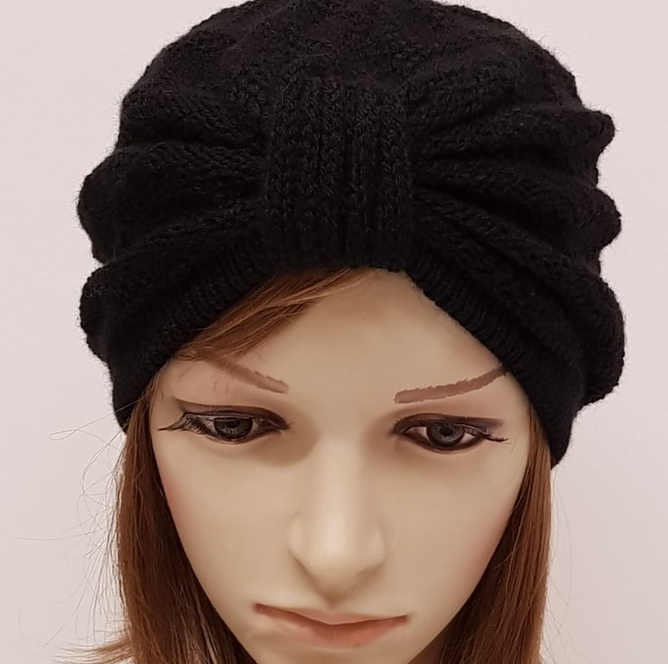 Handmade women's turban hat, black turban, knitted top knot hat.