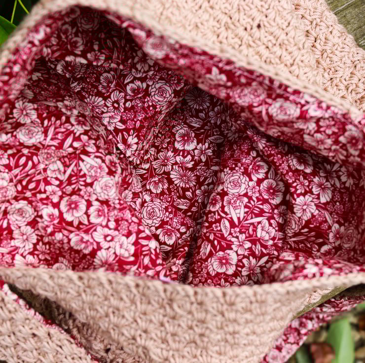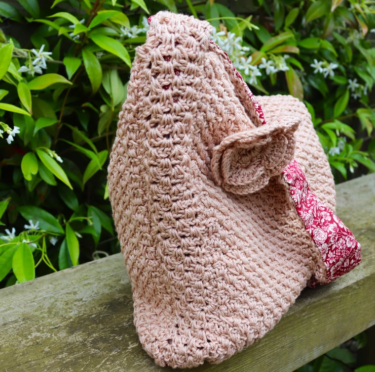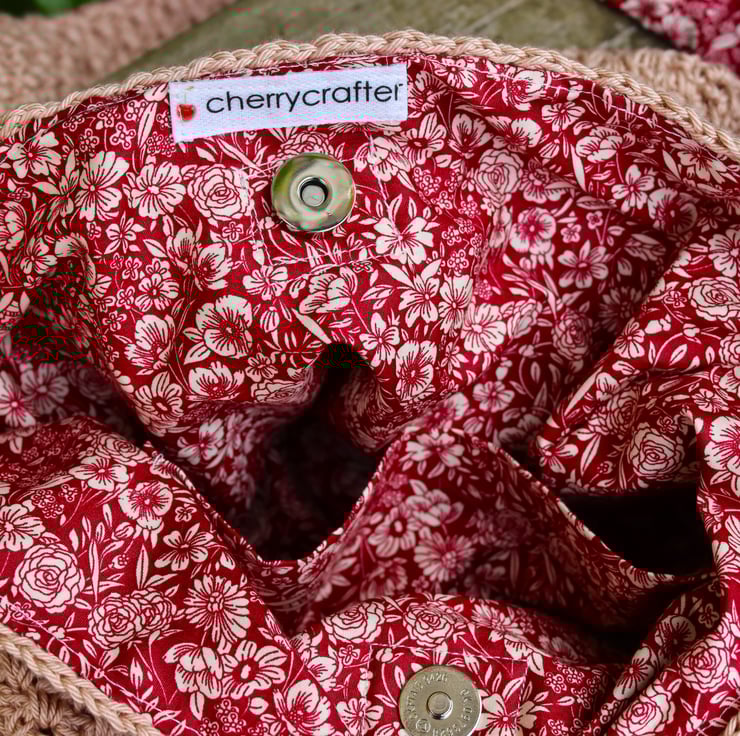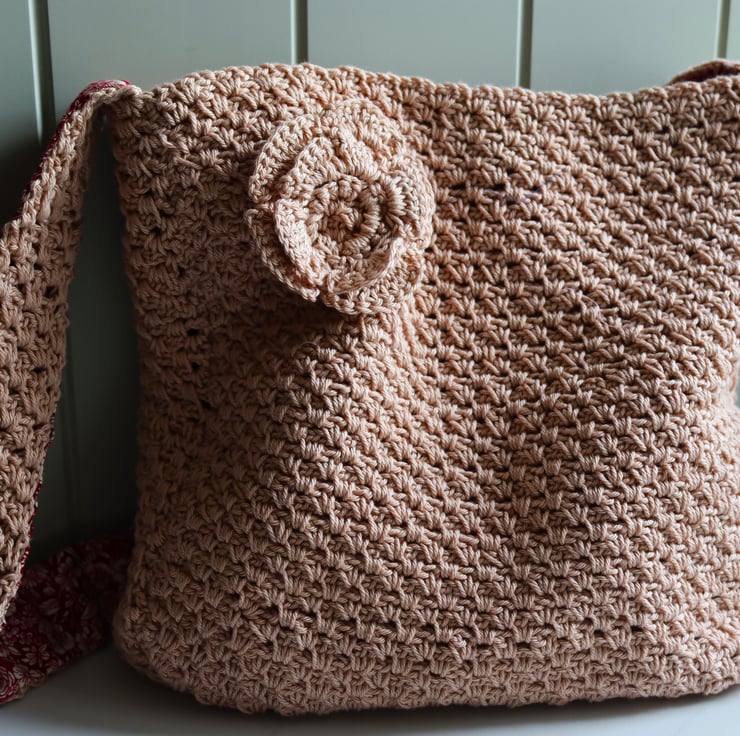 This crochet shoulder bag is a made from caramel coloured cotton yarn. The shoulder strap and flower adornment are made from the same yarn . It is fully lined with a red floral cotton fabric with an inside pocket and a magnetic closure. The bag is machine washable. It measures approx w27cm h27cm d4cm.. The strap is approx 84cm and this is also lined to prevent it stretching.