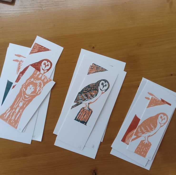 Individually hand printed bookmarks, or journal tags etc. each features a barn owl, choose from flying, silhouette flying, on a post or chick in tree.