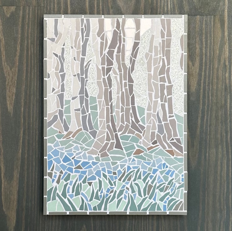 I made a close-up bluebell mosaic which I really enjoyed and thought I would try a wider woodland view. It is quite a different approach, making the design more abstract and letting the eye fill in the blanks. I played with different shapes for each element to give the piece movement. I hope you like it.