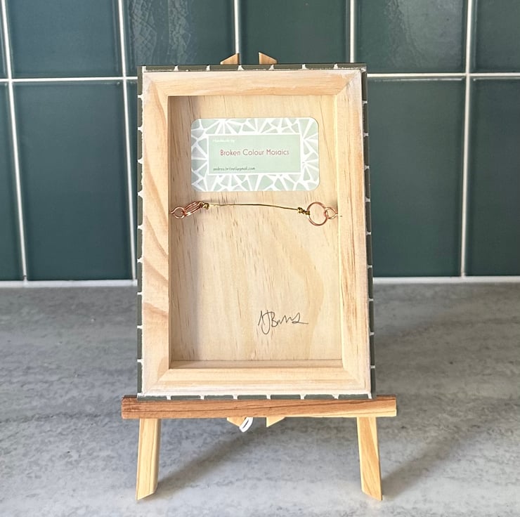 I use beautiful Winckelmans tiles which are matt ceramic and come in soft muted tones. I hand cut each piece of tessera to create intricate images inspired by nature. The mosaic is mounted on a wooden canvas and the sides are part tiled to frame the plaque and give depth and is complete with hanging wire.