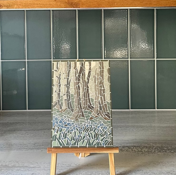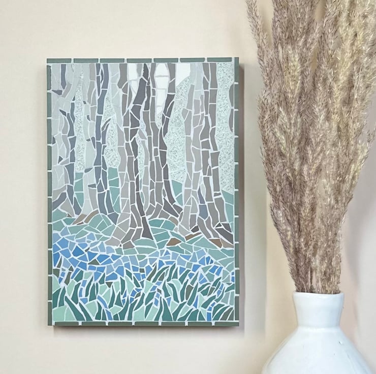 This unique floral art is created in mosaic. It features a springtime woodland view with hints of bluebells growing beneath the tree trunks. The trees are created with vertical pieces of tessera in shades of brown and grey and a trail of blue meanders through a carpet of green leaves. I tried to create a light and delicate effect and a sense of a springtime walk. This piece has gunmetal grey grout and is framed with a row of dark, sage green tiles.