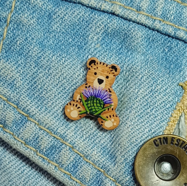 Scottish Thistle Pin, Handmade Scottish Gift, Tiny Bear Brooch, Scotland Teddy